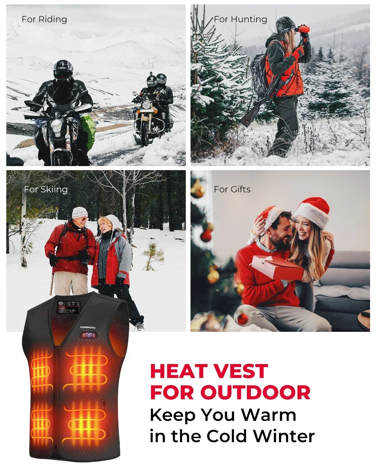 Specifications Surface material: diving cloth Lining material: crystal velvet Heating wire: carbon fiber Power: 5V/2A Heating area: 8 heating areas Gender: Men Package 1x Heated Vest (Battery not included) ②WOMEN'S HEATED VEST Features 1.8 Heating Zones: Our heated vest features 8 heating zones (chest 2, stomach 2 and back 4), providing you with 360-degree warmth. 2.3 Heating Settings: Easily adjust to your desired temperature with three heating settings-high, medium, and low-controlled by a simple button. 3.Light Off Function: Choose to turn the lights on or off based on your preference, catering to different user needs. 4.Adjustable Heating Zones: Unlike other heated vests on the market, ours comes with two control buttons. You can select the heating zones you need-chest and abdomen or back. This promotes blood circulation and alleviates muscle tension in different areas. 5.Soft Material: Made with ultra-soft fabric, our vest keeps you warm and comfortable. It's thin, lightweight and stretchy, making it perfect to wear under other clothes or jackets for warmth and style. 6.Easy to Care: The vest is machine washable and hand washable for your convenience. 7.Easy to Use: Simply connect to a 5V/2A power bank to use the heated vest without any hassle. Compatible with most 5V/2A battery on the market (Battery not included) 8.Perfect Gift for Family and Friends: Ideal for skiing, motorcycling, fishing, or other outdoor activities, this heated vest is the best choice to keep everyone warm during the cold winter. Specifications Surface material: diving cloth Lining material: crystal velvet Heating wire: carbon fiber Power: 5V/2A (Battery not included) Heating area: 8 heating areas Size:S-XXL Gender: Women Package 1x Heated Vest (Battery not included)