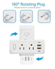 Return Policy Fast Delivery Trusted seller USB Outlet Extender Surge Protector - with Rotating Plug, 6 AC Multi Plug and 4 USB Ports(2 USB C),15A 1875W, 3-Sided Swivel Power Strip Spaced Splitter for Home, Office, Travel Product Description 【Wall socket adapter】: This wall plug extender comes with 6 AC sockets (15A/1875W/125V) and 4 USB ports, allowing it to charge up to 6 devices simultaneously without the need for additional wires or causing confusion. It is suitable for other devices such as IPhone15, iPad,cameras, razors, computers, etc 【USB Port Expander 】: This multi plug socket is designed with 4 USB ports, with 2 USB-A ports that can charge up to 5V/2.4A, 2 USB-C ports that can charge up to 5V/3A, and 4 ports that output 5V/3.4A together. The charging speed will be faster than other socket adapters. 【90° PLUG SWIVEL PLUG】: Our surge protector receptacles come with a 90° swivel plug, made of fire-rated ABS+PC material shell, which is resistant to high temperature of 1382 ° F for improved heat resistance and safety, with a separate switch to control the entire power supply, allowing you to use it safely and protect your family. 【 wide Spacing Design 】: 3 independent design plugs, 6 AC sockets, with 0.8 inch spacing space, compatible with 6 devices at the same time, can accommodate large adapters without crowding or mutual blockage, easy to install in narrow spaces or behind furniture. 【 Compact and Portable 】: This rotary adapter measures 4.88 * 1.96 * 1.96 inches (length * width * height), making it easy to carry when traveling. This USB socket extender is perfect for places such as dormitories, beds, kitchens, study rooms, and offices. We offer a 1-year worry free warranty and a 30 day return and exchange policy. Please contact us promptly if you have any questions, and I will provide a solution within 24 hours.We will give you a USB night light as a gift, with a random color! Shipping Returns Payment Shipping Shipping is FREE to all addresses other than APO/PO boxes in the lower 48 states. All our stock ships from US-based warehouses. Shipped via USPS or UPS (depending on location and package weight) Unless stated otherwise, all orders will ship within 24-72 hours of your payment being processed. Check our feedback to see the great reviews of FAST shipping we offer. Returns Seller does not accept returns Payment We currently accept payment via eBay managed payments only. Once payment is cleared, we will dispatch your shipment within 1-3 business days. Please refer to the "Shipping" tab for more information regarding shipping speed to your destination.