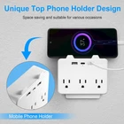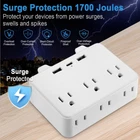 Plug Surge Protector Smart USB Charging High-speed USB ports automatically detect charging devices and deliver optimal charging speed, it can charge 3 portable devices simultaneously. Space-Saving Design & Fun Design 6 Outlets & USB C and 2 USB A Ports. 2-sided design and 6 AC wide spaced outlets accommodate oversized power adapters.Also, your cell phone could be put on the top phone holder conveniently when charging. Surge Protector This outlet splitter comes with 1800 Joules Protection Rating, safeguards appliances and equipment from potentially damaging power surges. Notice: Do not exceed the total rating or it may cause damage to the unit and fire hazards. Package list: 1 x Surge Protector Power Strip with USB Port 1 x Instruction Manual 1 x Paper Box 【9 IN 1 Function USB Wall Power Strip】- 6 AC outlet splitter (2 side, 15A/125V/1875W) with built-in 1800 Joules surge protector and 3 USB charging ports (1 USB C, total output DC 5V/2.4A).The grounded indicator light that assures your devices are secure. 【USB- C Smart Charging Ports】- With built-in smart IC technology, high-speed USB ports automatically detect charging devices and deliver optimal charging speed, USB A up to 2.4A/5V per port, are compatible with most USB devices. 【1800J Surge Protector Outlet】- The multiple plug outlet provide surge protector electrical spikes. 3 complementary Surge Protection Circuits, TVS(transient voltage suppressor) MOV(metal oxide varistor) GDT(gas discharge tube), with response speed less than 1Ns, and minimum energy-absorbing capacity of 1800 Joules, much more quickly and reliably than the traditional MOV surge protector circuit. 【Wide Space & Top Holder Design】 - Unique 2-Side space-saving design power strip(11.8*5.8*9.4cm), 6 AC outlets with wide space in between.You can put your phone, tablet on the top holder for charging or watching movies in kitchen even if the multi-plug outlet is not near the table and easy to carry, use anywhere needed. 【Safety Guaranteed】 - Certified by UL. USB outlet adapter prevent your electric devices from over-current/over-charge/ short circuit/over-heated. Fire-resistant ABS shell (1382℉), and high-quality component can improve durability and safety.