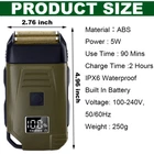 Specification Feature: Newly designed army green double-edged shaver, a machine to solve the problem of hair and beard, LCD display to check the battery at any time, IPX6 body waterproof performance, lightweight design and easy to carry. Work:Cord/cordless Type: USB Rechargeable Usage Time: 90 mins Charging Time: 2 hours Voltage: 100-240V,50/60Hz Material: ABS Weight : 250g Color : Army Green Machine Size : 4.96*2.76*1.4inch Package Size : 15.2*9.*4.5cm/6.1*3.7*1.7inch Package Included: 1* trimmer 1* Protective cover 1*charger 1* Cleaning brush 1* Manual