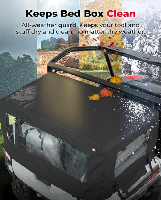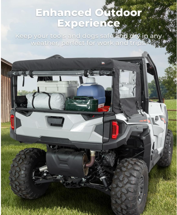 Perfect Fits: KEMIMOTO Cargo Bed Cover compatible with 2016+ Polaris General 1000 /4 1000/ XP 1000/ XP 4 1000. Keep Safe & Clean: Whether you're going on a hunting/camping trip or working outdoors, KEMIMOTO bed cover turns your UTV bed into a tent-like shelter. Shield your dog and belongings from dirt, debris, and harsh weather, it ensures a clean and secure ride every time. High-quality Material & Water-resistant: KEMIMOTO UTV cargo bed cover made of steel frame with tubular support bows. 600D water-resistant Oxford fabric with transparent windows. It effectively shields against wind, snow, sand, mud, and tree branches, and blocks rain and UV. Roll up Effortlessly Flexible: Enjoy convenience with KEMIMOTO's UTV bed cover! Each transparent window can be easily secured or rolled up individually, allowing quick access to cargo or improved ventilation. Easy Installation: No drilling is required; the KEMIMOTO UTV bed cover is easy to install and remove. Come with the installation instructions. Just open the zippers on both sides, release the hooks, and you can access the items on your bed.