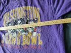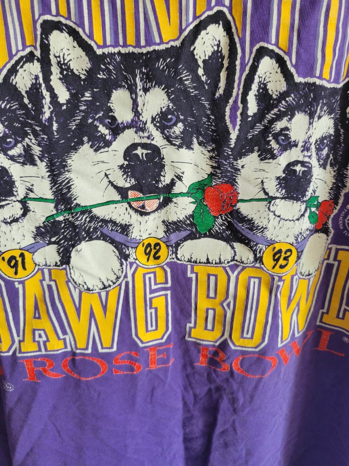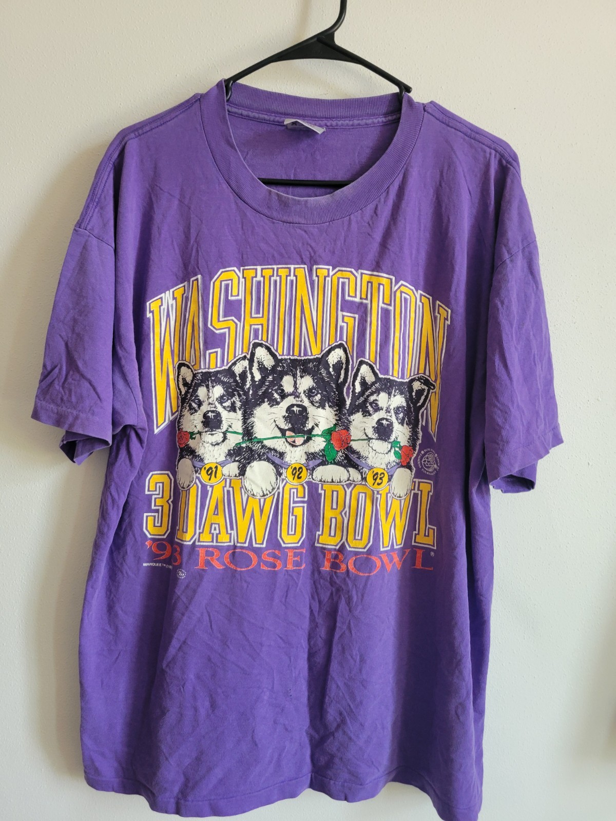 The product is a vintage UW Washington Huskies 1993 Rose Bowl 3 Dawg Bowls Print T-Shirt in size XL. The shirt features a solid purple color with a crew neck and short sleeves, made of cotton material. It has a regular fit and is suitable for all seasons. The shirt is branded as Oneita and has a theme related to the Rose Bowl. Perfect for men who are fans of the Washington Huskies and enjoy vintage apparel.
