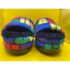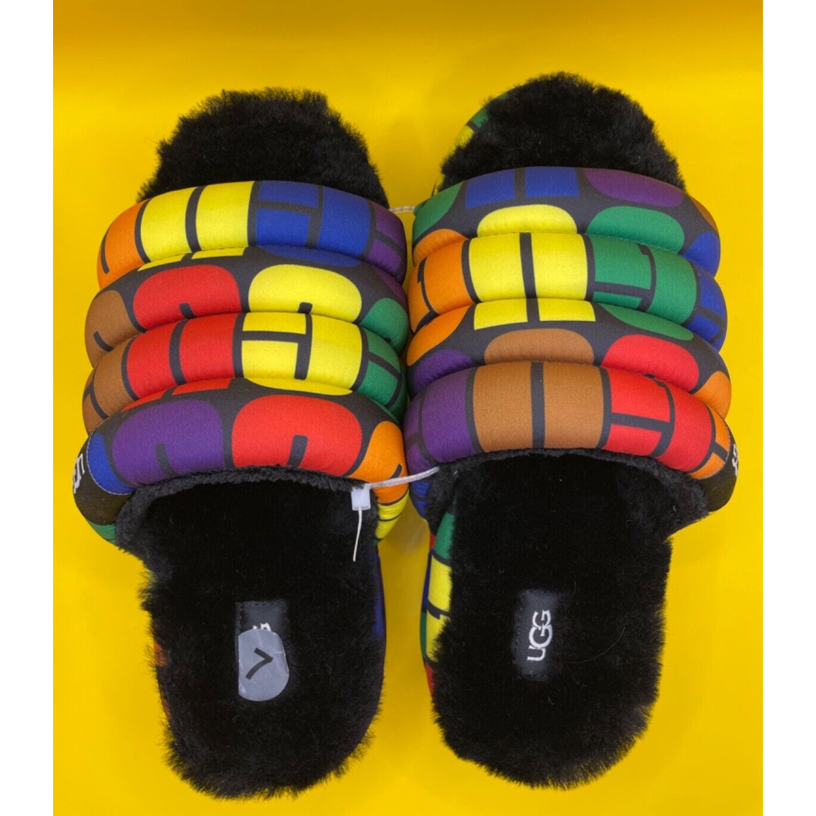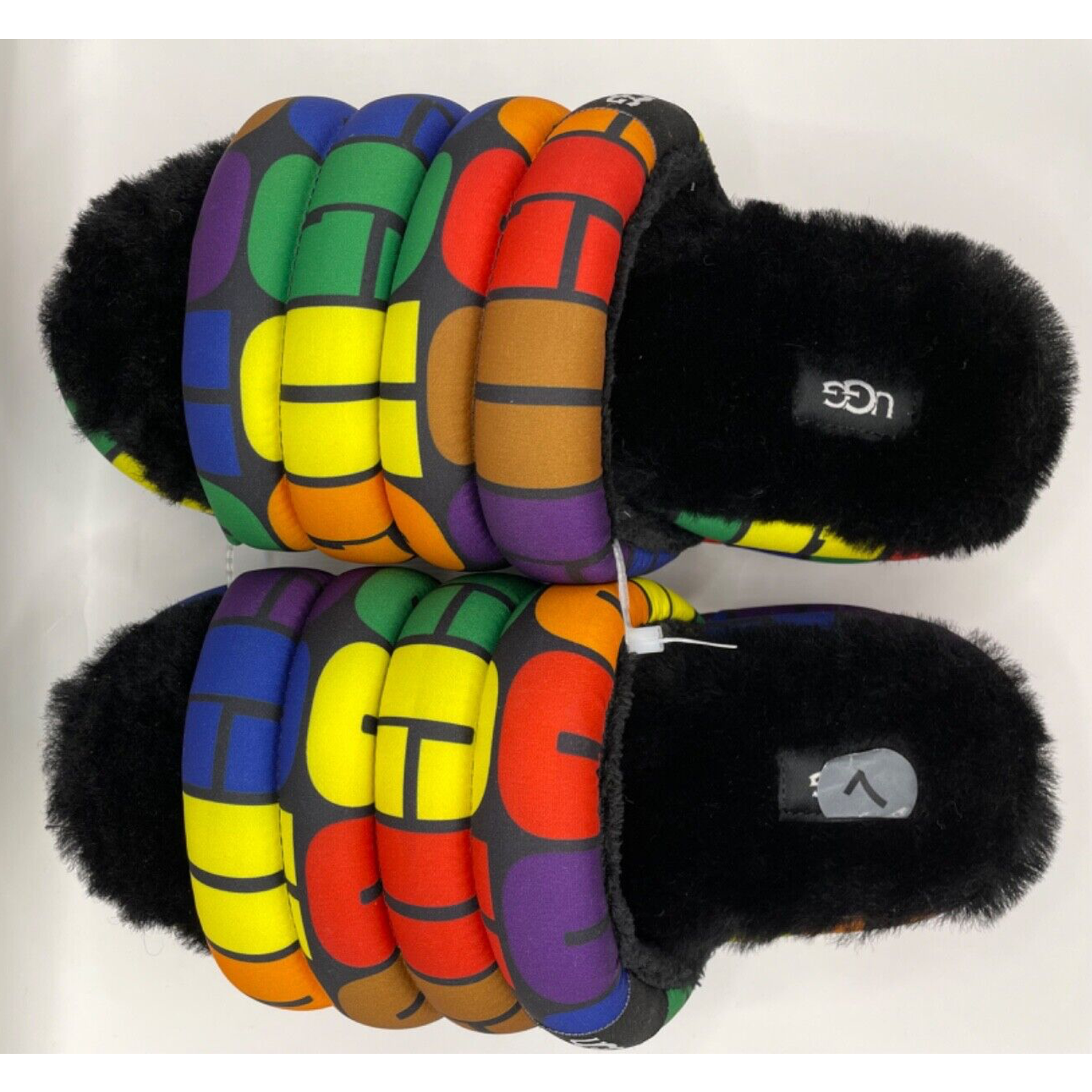 Slide into summer with these limited edition Ugg Maxi Pride sandals. The colorful rainbow logo and faux fur accents make these slip-ons perfect for any casual occasion or travel adventure. The cushioned insole and lightweight design provide all-day comfort, while the rubber outsole ensures durability. These sandals are available in women's size 7 and feature a block heel with a mid-height of 2-2.9 inches. The faux fur lining and upper material add an extra touch of luxury. Whether you're heading out for a night on the town or running errands around town, these Ugg Maxi Pride sandals are the perfect addition to your shoe collection. These eye-catching UGG sandals are new without the box and have never been worn. However, do notice a little imperfection in the sole near the UGG logo. Please refer to pictures.