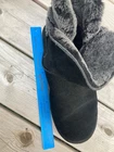 The product is a pair of Ugg short boots in black with a gray shearling lining, designed for women in size 10.5/11. These ankle boots feature a round toe shape, pull-on closure, 1-inch platform height, and low 1-1.9 inch heel. The boots are lined with sheepskin and made with suede upper material, providing comfort and warmth. Made by UGG in Australia, these boots are part of the Ugg Classic Short product line and are perfect for outdoor or casual wear. These have the size tags removed and appear to be a women’s size 10.5 or 11, and possibly a wide width. The soles measures 12” long. They measure 4.5” wide. These do not show much wear.