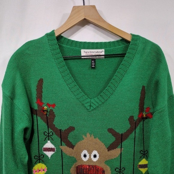 Festive green sweater with a reindeer design. Perfect for holiday celebrations. Features Green Reindeer V-neck Holiday Christmas Ugly Christmas Sweater Cozy Comfy Warm Great Pre-Loved Condition SIZE XL Measurements Pit to Pit: 20.5" Length: 29" Waist: Rise: Inseam: Length: Please check to be sure of fit Smoke Free Pets Free Please feel free to contact me for any questions or offer Bundle Discounts Offered Fast Shipping 51107-1713