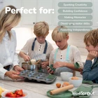 COMPLETE KIDS BAKING SET: This kids baking kit includes: an apron, 2 oven mitts, 2 silicone baking mats, 12 silicone cupcake liners, an icing spreader, 2 silicone icing containers with 6 icing tips, plastic measuring cups and spoons, a stainless steel bowl with lid, 3 stainless steel cookie cutters, a wooden stirring spoon, a wooden rolling pin, and instructional cards. With this baking and cooking set for kids, your little chef has everything needed for kids cooking and baking adventures! DESIGNED FOR SMALL HANDS: The plastic measuring cups and spoons fit comfortably in little palms, while the wooden rolling pin and spoon are sized just right for kids cooking and baking. The stainless steel bowl is perfect for mixing, and its lid keeps ingredients fresh. Tiny bakers will love using the cookie cutters to create fun shapes. With silicone baking mats, cupcake liners, and icing tools, this baking kit gives your child all the kids cooking utensils they need to feel like a pro. SAFE FUN: Every item in this baking kit is created with your child's well-being in mind. The plastic components are free from harmful chemicals, for peace of mind during kids cooking sessions. We've included two oven mitts to protect little hands from heat. The silicone cupcake liners and baking mats are non-stick and easy to clean. With our kids cooking sets, you can relax knowing that your child's culinary adventures are as safe as they are enjoyable. LEARN THROUGH BAKING: The included recipe and instruction cards are designed to be developmentally appropriate, guiding children & parents through each step of the baking process. As they measure, mix, and decorate, kids naturally absorb concepts of math, science, and following instructions. This baking and cooking set for kids fosters independence and problem-solving skills. Watch as your child's confidence grows with each successful baking project wtih our kids cooking and baking set. GIFT OF CREATIVITY: Our kids baking sets for girls and boys make an amazing gift! This comprehensive baking kit sparks creativity and provides hours of fun. Whether it's for a birthday, holiday, or just because, young bakers will be thrilled to receive their very own kids cooking utensils. Give the gift of culinary exploration and watch as the recipient's eyes light up with excitement for their kids cooking adventures!