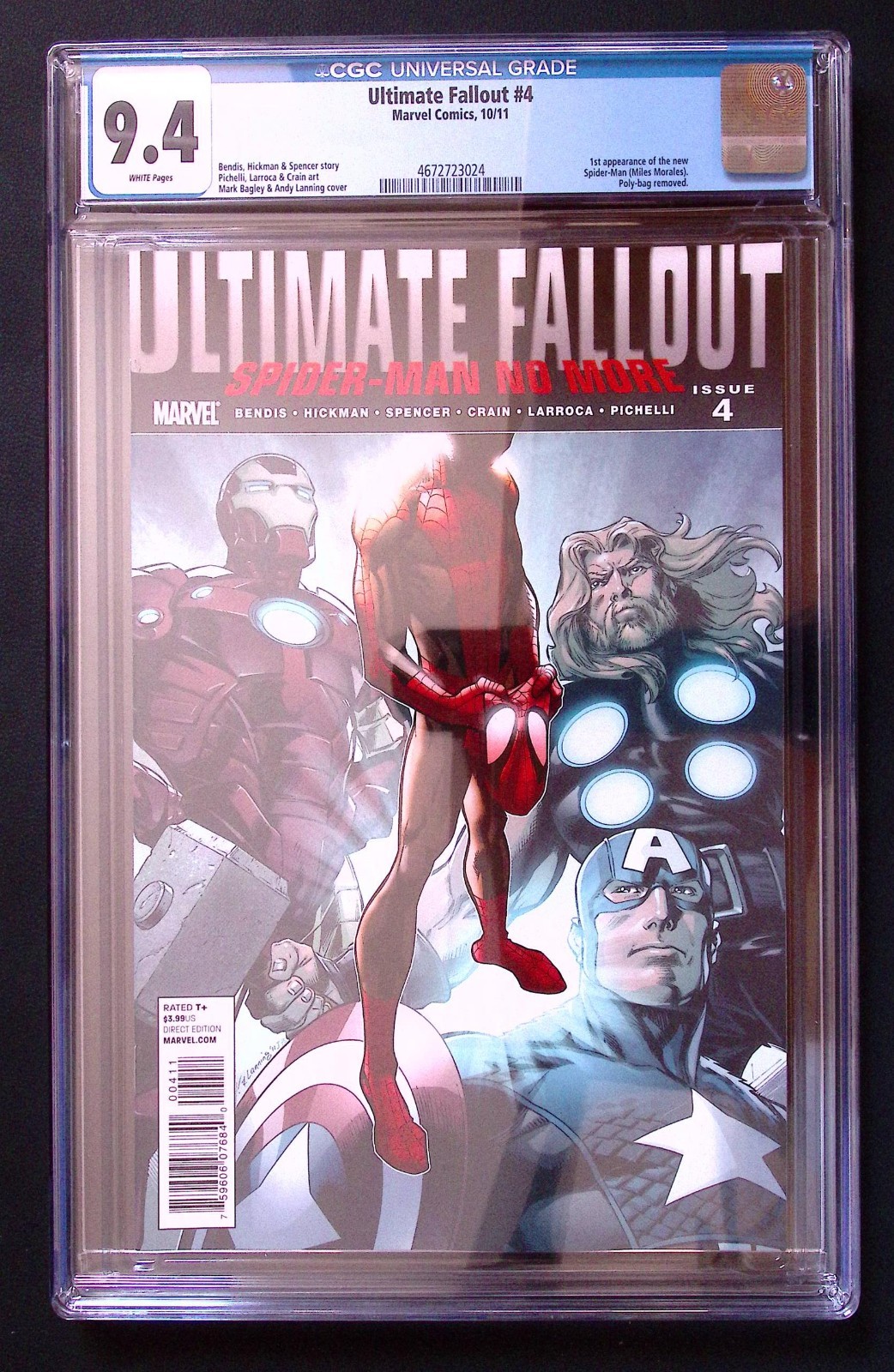 📘 Ultimate Fallout #4 (2011) – CGC 9.4 White Pages Publisher: Marvel Comics Year: 2011 Issue: #4 Grade: CGC 9.4 (White Pages) Certification: CGC Universal Label Case: Clean, sealed CGC holder 🔑 Key Issue Details First full appearance of Miles Morales as Spider-Man One of the most important modern Marvel keys of the 21st century Foundation issue for the Spider-Verse era and Miles’ rise to mainstream popularity Highly sought after by collectors and investors alike 🧾 Condition Notes Professionally graded CGC 9.4 with White Pages Slab is clean and intact with no cracks Please review all photos carefully, the exact book shown is the one you will receive 📦 Shipping Securely packaged with full protection Shipped tracked and insured Fast dispatch from a trusted UK seller ℹ️ Additional Info This is an original 1st print , not a reprint or later edition A cornerstone book for any serious modern Marvel or Spider-Man collection