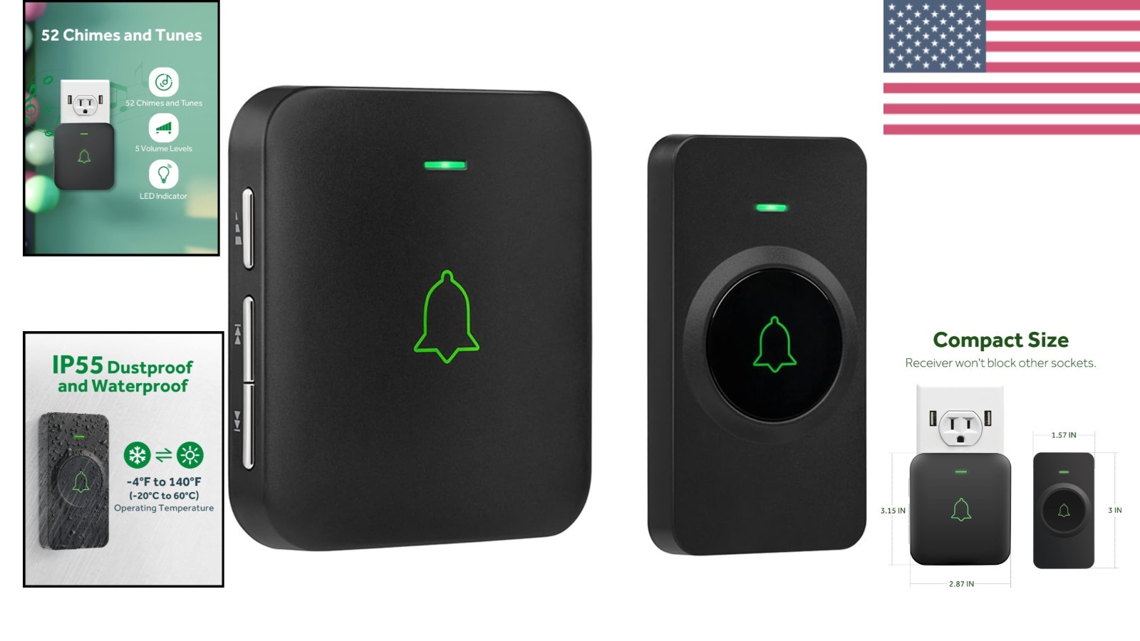Ultra Long-Range Wireless Doorbell Chime - Waterproof & 52 Melodies, 115dB ‹ › ‹ › ‹ › ‹ › ‹ › ‹ › ‹ › ‹ › ‹ › ‹ › Ultra Long-Range Wireless Doorbell Chime **Waterproof & 52 Melodies, 115dB** Features: Simple Setup: Just plug the mini receiver into a socket and fix the transmitter on a wall with the accessories provided, including screws, anchors, a key, and double-sided bonding tape. Ultra Long Wireless Range: Enjoy an impressive 300 meters (1000 feet) wireless range. The plug-in receiver will not interfere with other equipment in your home or those of your neighbors, ensuring you clearly hear every visitor. Rich Sound Quality: Experience 52 chimes to choose from. The 1.1 in (29 mm) stereo speaker delivers rich and crisp sound with 5 adjustable volume levels, reaching a maximum of 115 dB. High-Performance Transmitter: Designed with ultra-low power consumption, this doorbell chime operates on a lithium battery with a lifespan of up to 3 . Its waterproof and dustproof rating ensures reliability in various weather conditions, functioning between -4 °F to 140 °F. Memory Function: The doorbell remembers your last melody and volume level after a power outage, eliminating the need to reset your preferences. Benefits: Effortless installation allows you to start using your doorbell in minutes. A powerful wireless range ensures you will never miss a visitor. A wide selection of melodies offers personalization to fit your taste. Robust construction guarantees performance regardless of harsh weather. Convenient memory function enhances user experience by retaining settings. Why Choose Our Ultra Long-Range Wireless Doorbell Chime? Transform how you welcome visitors with our Ultra Long-Range Wireless Doorbell Chime. This elegant yet functional addition to your home boasts a seamless design and an easy setup process that can be completed in moments. With its wide range and rich audio quality, you'll never be left wondering if someone is at the door. Select your favorite melody from an expansive collection, and rest easy knowing you’ll hear every visitor, no matter where you are in your home. Choose sophistication and reliability in your doorbell experience—order yours today to embrace convenience in style! Shipping Free & Fast Shipping - We offer free shipping to most of the USA with a normal delivery time of 3-7 days. However, due to the current situation, additional delivery time (up to 3 weeks) may be required for some items. Alternative Carriers - We may use alternative carriers (e.g. USPS, FedEx, UPS, etc.) to ensure your package arrives safely and on time. Due to the use of multiple carriers, we are unable to provide a tracking number automatically. Handling Time - Orders are processed and shipped within 1-2 business days of receiving cleared payment. Shipping Restrictions - Shipping to Alaska, Hawaii, Puerto Rico, Guam, and other US territories may incur shipping charges or delivery restrictions. Please contact us before ordering, or your order can be refunded/cancelled. State Restrictions - There may be restrictions based on your state of purchase. For example, certain items may not be shipped to California due to state regulations. Contact for Tracking Updates - If you require tracking updates or have any concerns about the delivery of your order, please feel free to contact us, and we will be happy to assist you. Return 30-Day Hassle-Free Returns - We want you to be completely satisfied with your purchase. If you are not, you can return the item within 30 days of receiving it for a full refund or exchange. Easy Return Process - To start a return, simply contact us and we will provide you with a prepaid return shipping label and detailed instructions. Restocking Fee - There are no restocking fees for returns. However, the buyer is responsible for return shipping costs if the return is not due to a seller's error. Refund Processing Time - Refunds will be processed within 5 business days of receiving the returned item in its condition. Payment We accept all major credit cards, PayPal, and Apple Pay for your convenience. Your payment information is secure and encrypted to ensure a safe and seamless transaction. Please complete your payment within 3 days of purchase to avoid any delays in shipping. Feedback Your feedback is extremely important to us. We strive to provide the best products and customer service possible. If you are satisfied with your purchase, please take a moment to leave us a positive review. If you have any concerns or issues with your order, please contact us before leaving negative feedback. We are committed to resolving any problems and ensuring your satisfaction. Contact Us If you have any questions or concerns, please feel free to out to our customer support team. You can contact us through the eBay messaging system. We are available Monday to Friday, 9:00 am to 5:00 pm EST, and we will do our best to respond to your inquiry within 24 hours. Buy it now and enjoy a pleasant shopping experience! Voltage: 3 V Unit Quantity: 5 oz Material: Plastic Features: Waterproof,Portable Power Source: Battery Items Included: Screws,Transmitter,Receiver,Adhesive Tape,Screwdriver,Anchors Suitable For: Home Type: Digital Connectivity: Wireless Number of Batteries: 1 Color: Black Finish: Matte Item Weight: 5 oz Style: Modern Button Material: Plastic Button Shape: Square Shape: Square Power: 5 W