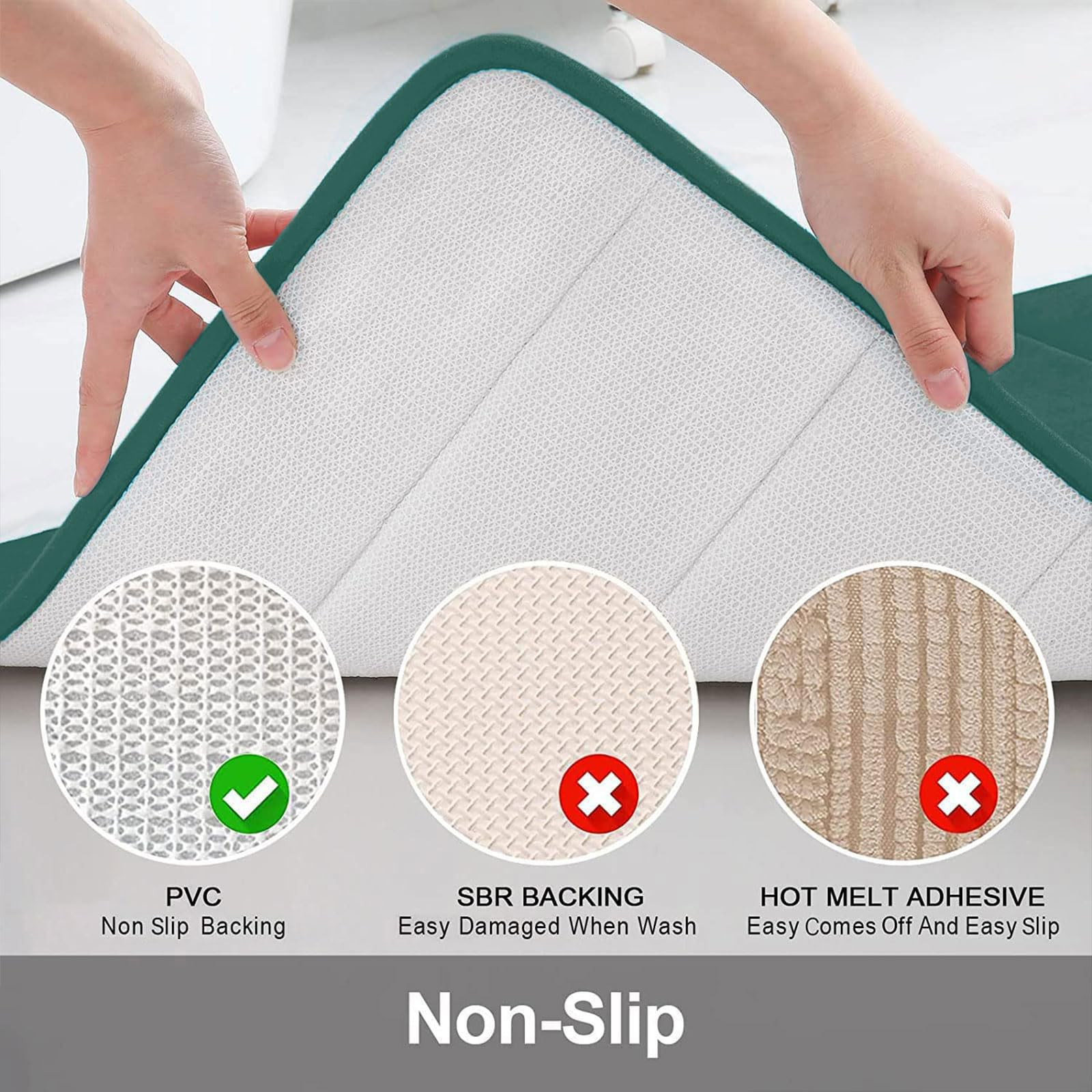 SOFT & COMFORTABLE: Bath mats are filled with polyurethane memory foam and the microfiber velvet outer material, soft and cozy, skin-friendly, relieve pressure and fatigue on your feet NON-SLIP PVC BACKING: Bathroom mats feature a non-slip mesh back to prevent the mat from shifting and skidding, and the rubber back prevents water from seeping to the soft surface. WARNING: Place mat on CLEAN DRY SMOOTH FLOOR only. Water under bath mats can cause it to slip. Keep bottom of mat dry. Before using bath carpet, test with foot to ensure it doesn't move WATER-ABSORBENT: Bath rugs are treated with memory foam to absorb water and dry quickly, keeping your bathroom away from water, and keep clean every day EASY CLEANING: Machine wash in cold water. Do not use chlorine or bleach. Tumble dry on low heat or lay to air dry, the color will not fade with continual uses. Please measure the size before purchasing these mats Remove the Crease: Our bath mat is packaged using our innovative rolled packaging method. To effectively remove the creases, please follow these steps: 1. Place a damp towel over the folded sections of the bath mat; 2. Gently press and move the iron across the mat periodically. This process should significantly reduce the creases, Once the creases are minimized, the bath mat can be placed anywhere in the bathroom
