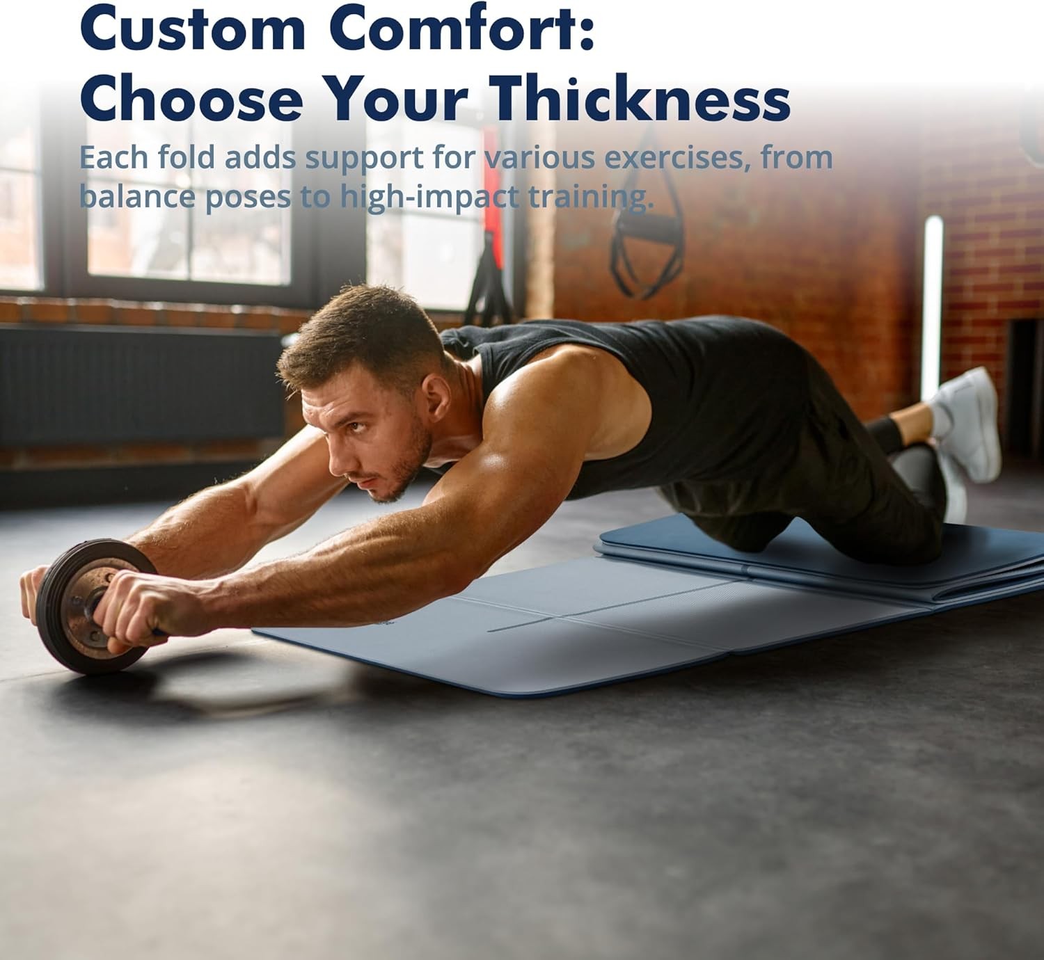 Just got this foldable yoga mat and it's a game-changer for my workouts! The perfect thickness when folded gives amazing cushioning for planks and ab exercises. Love how it packs up small for travel but feels so sturdy during use. The non-slip surface really works too - no more sliding around during intense sessions!