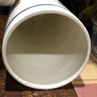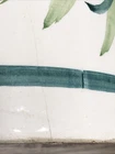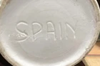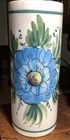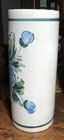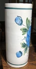 This is a ceramic umbrella stand from Spain, featuring a floral design. It measures 18 inches in height and 7 inches in width, making it suitable for holding umbrellas or canes. The stand embodies a flower theme, adding a decorative touch to your home organization. Comes from a smoke free home. Has a small hairline crack as shown.