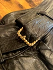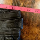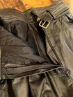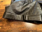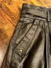 This product is a pair of vintage 90s women's high waist bareback shorts in size 10. Made from genuine leather in a solid black color, these shorts feature a snap and zip closure, gold buckle detail on the belt, and gold studs as accents. The pleated front adds a stylish touch to these shorts, which have a regular fit and a high waist rise. With an inseam of 19 inches and slash pockets, these shorts are perfect for adding a touch of 90s style to any outfit.