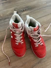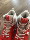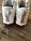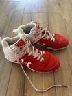 Under Armour Boys Leadoff Baseball Cleats in Red/White, Size 4 Youth. These cleats are designed for baseball and softball, featuring the Under Armour brand. They are a unisex design made in Vietnam. The cleats are suitable for youth players and come in a red and white color scheme.