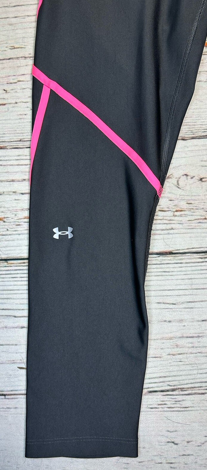 Elevate your workout game with these Under Armour Compression Leggings in a vibrant hot pink and grey colorway. Designed for women, these leggings feature a pull-on closure and a compression area on the leg for a flattering fit. The capri length and 23.5 inch inseam make them perfect for gym and training sessions, yoga, and running all in one! Crafted with quality materials and designed for performance, these leggings are perfect for any workout occasion. The brand's signature Heatgear technology wicks away moisture, keeping you cool and dry during your most intense workouts. These leggings are a must-have addition to any activewear collection and are available in size L. Check measurements for size. Has a mark on the back of one of the legs. See pictures for more details.
