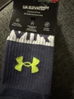 The Under Armour Elevated Socks are a stylish and functional addition to any man's wardrobe. These crew socks feature a striped pattern in blue, perfect for adding a pop of color to casual or workwear outfits. Made from a blend of polyester, spandex, and nylon, these mid-calf socks offer a comfortable fit for sizes 8.5 - 13. The seamless toe style and cushioned design make them ideal for various activities like gym and training, walking, tennis, running, and jogging. Machine washable and suitable for all seasons, these socks are a versatile choice for any man on the go.