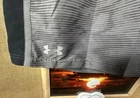 Under Armour heatgear men's athletic striped L shorts loose fitted elastic inside drawstring brief liner Vietnam excellent Please don’t hesitate to ask more questions--appreciate you shopping in good faith All measurements in inches material -- polyester color -- striped gray/black pockets -- 1 inside 2 outside waist -- 28 in unstretched rise -- 12.5 inseam -- 9 outside seam or top to bottom -- 19.5 leg opening -- 26 02/2015 Please compare these measurements to your existing comfortable clothing waist: measured lying flat across x’s 2 rise: measured from the top of the waistband to the crotch seam hips: measured under zipper across x’s 2 inseam: measured from the crotch seam to leg opening leg opening: measured flat across x’s 2 colors can be difficult sometimes to identify label sizes can be different due to shrinkage or hemming--please trust the measured size Smoke and pet-free