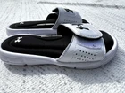 Under Armour Sandals 11K White UA Ignite V Slides Strap Foam Logo Slip On Kids Please see photos for measurements (in inches) We are happy to answer your questions! Super Fast Shipping: We ship out the next business day! Condition Preowned 9/10 No Hole, Rips, Stains ****glue around Smoke Free Home, Cat Friendly home washed and clean