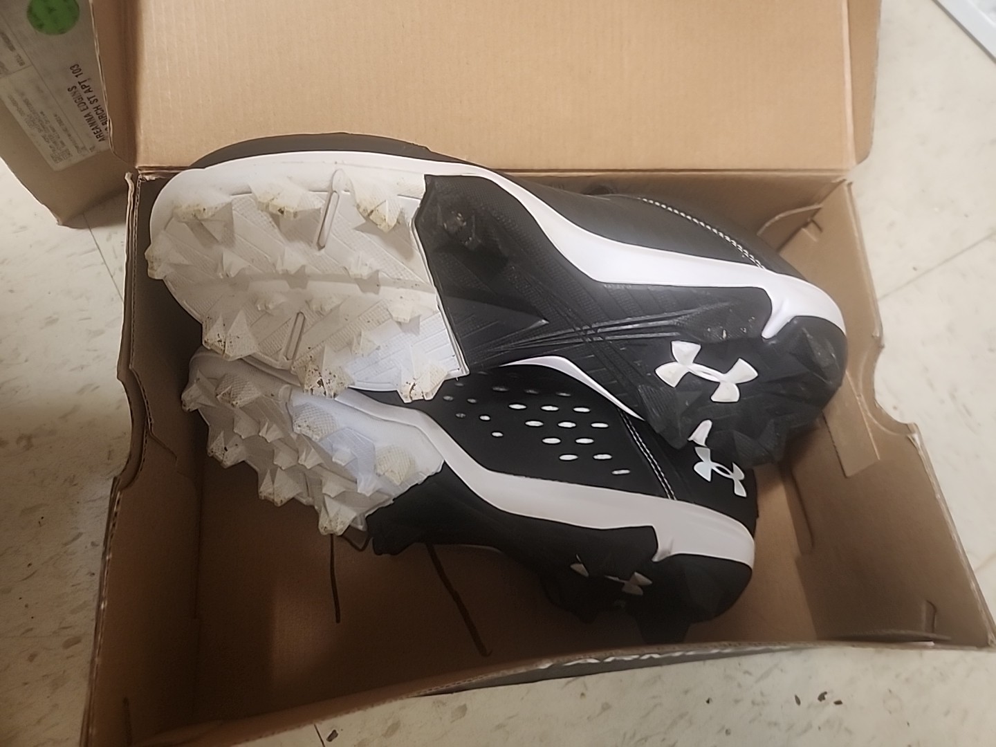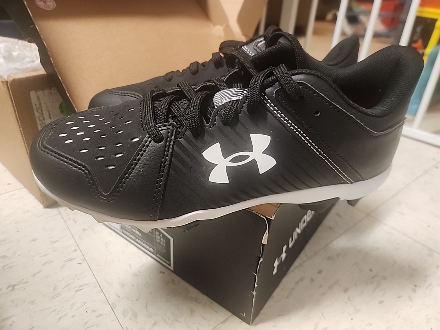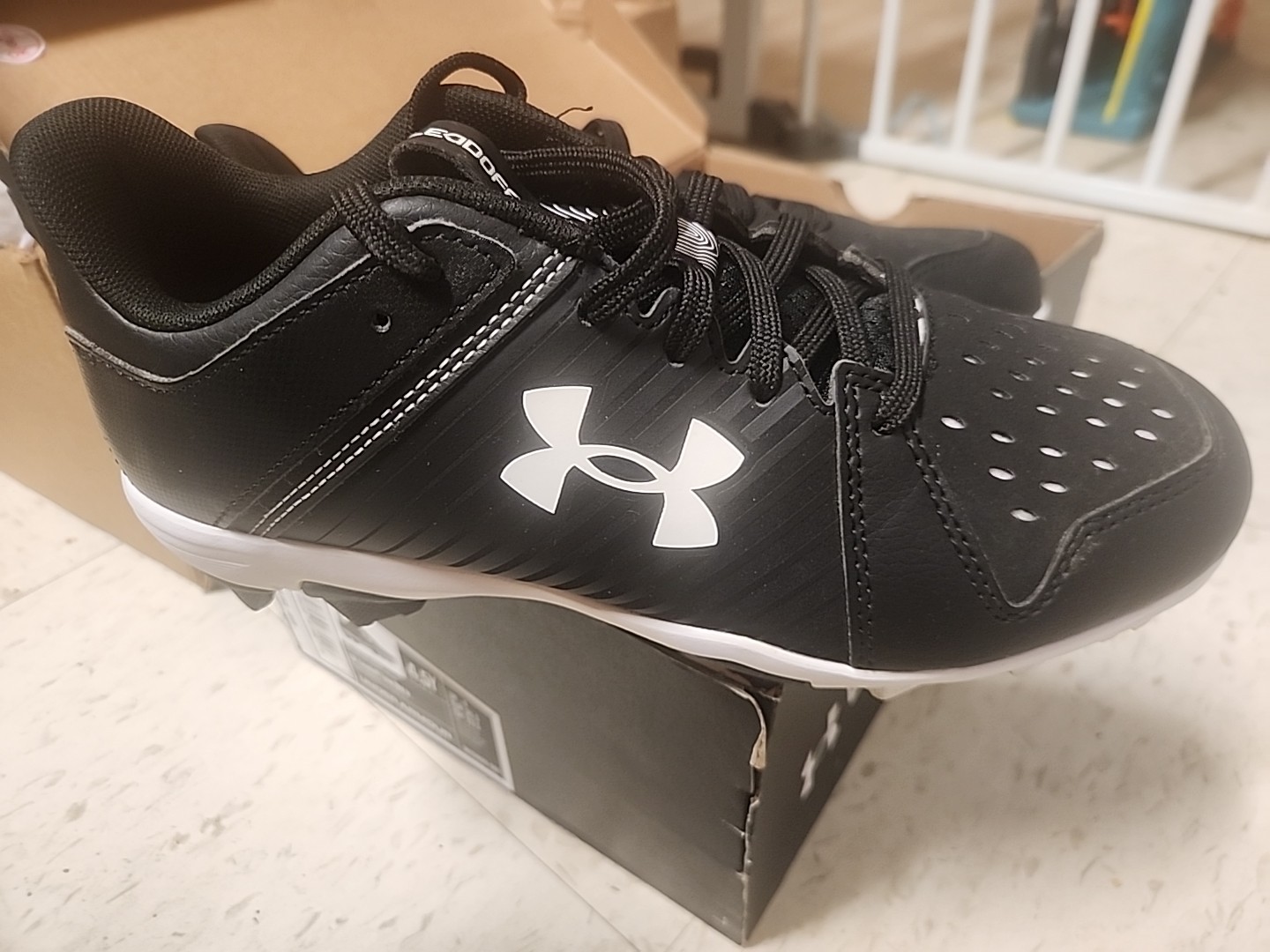 The Under Armour Leadoff Baseball Cleats in Black/White Boy's Size 4.5 Y are a stylish and durable choice for young baseball players. These cleats feature a black color scheme with a white accent, a comfortable medium shoe width, and a 1.5 inch heel height. Made of synthetic material, these cleats are designed specifically for baseball players and are perfect for any young athlete looking to improve their performance on the field. The Under Armour brand ensures quality and reliability, making these cleats a great option for young players looking to enhance their game.
