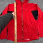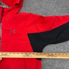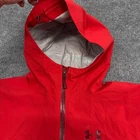Under Armour Jacket Mens Medium Red Storm Waterproof Long Sleeve Hooded Full Zip In perfect structural condition but there are a couple of light dark marks as shown. Please see photos for measurements.