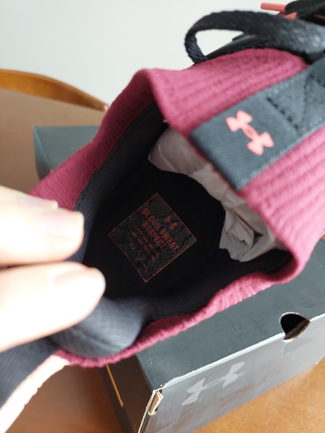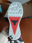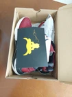The Under Armour Men's UA Project Rock 4 Training Shoes in red and black, size 8.5, feature a low top silhouette with cushioned, lightweight, and breathable mesh upper. Designed for gym and cross-training, these athletic sneakers from the Under Armour Project Rock line offer comfort, stretch, and standard shoe width for optimal performance during bodybuilding workouts. Box damage