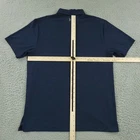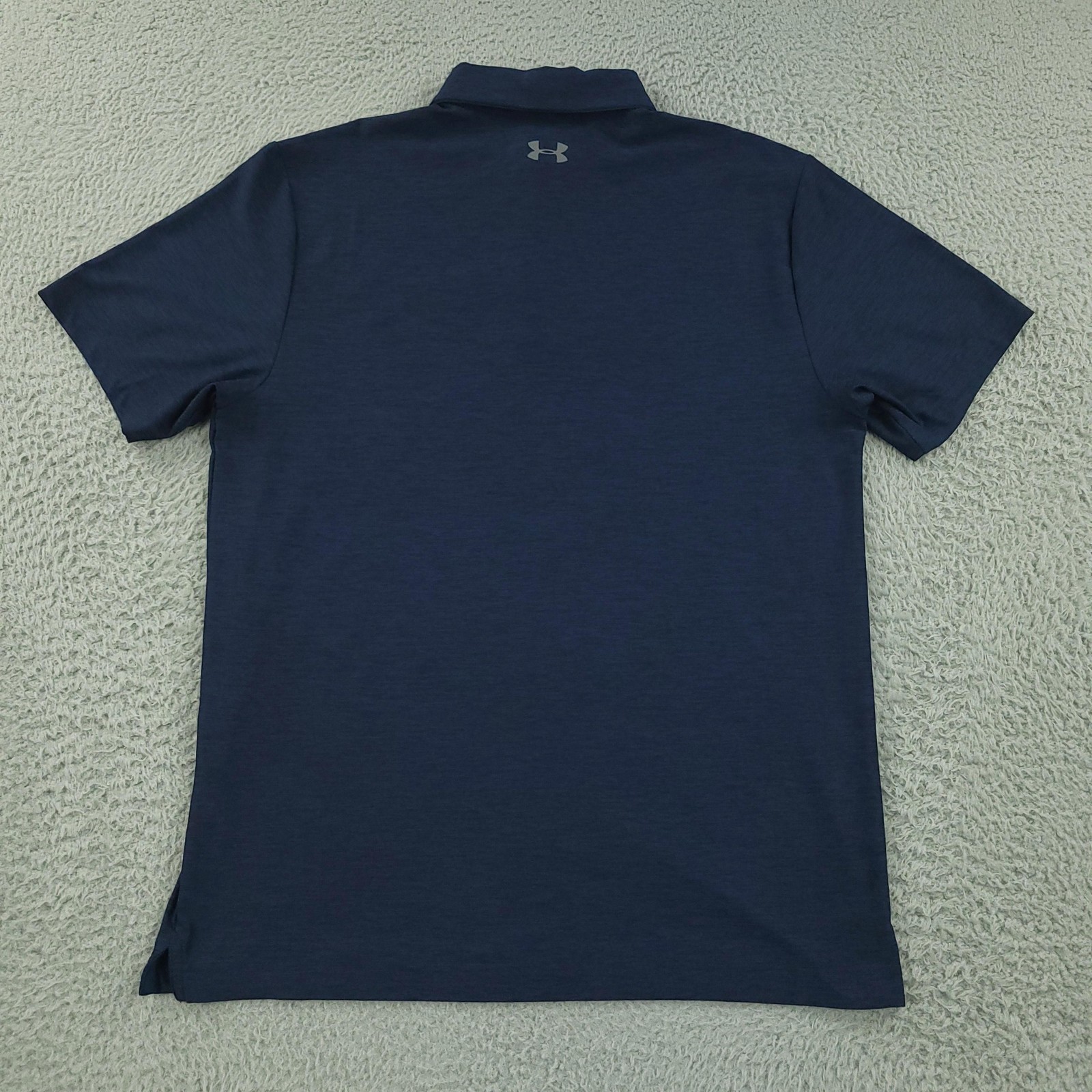 Brand: Under Armour Style: Mens short sleeve polo shirt with three-button placket and spread collar. Color: Navy blue heather with contrasting gray inner collar. Size on tag: Medium (MD / M / M) Fit: Loose fit; Under Armour HeatGear performance fabric. Details: Under Armour logos at left chest and back neck, lightweight breathable athletic material, straight hem with small side vents, suitable for golf, training, or casual wear. Made in Vietnam. Washed and dried with Fragrance Free Detergent & Dryer Sheets. Measurements are included in the photos, compare measurements with your item to ensure proper fit. (Measurements are done with the item lying flat). I ship next business day and all items include tracking. Items are added daily to my store