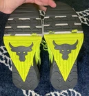 This is a pre-owned pair of Under Armour Project Rock 3 sneakers in size 9.5 for men. The color is High-Vis Yellow/Black/High-Vis Yellow, featuring a mesh upper material and a vibrant design. The style code is 3023004-306, released in 2021 with a release date of 20210205. Made in Vietnam, these athletic shoes are part of the Under Armour Project Rock product line.
