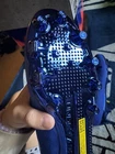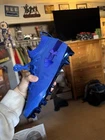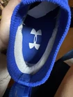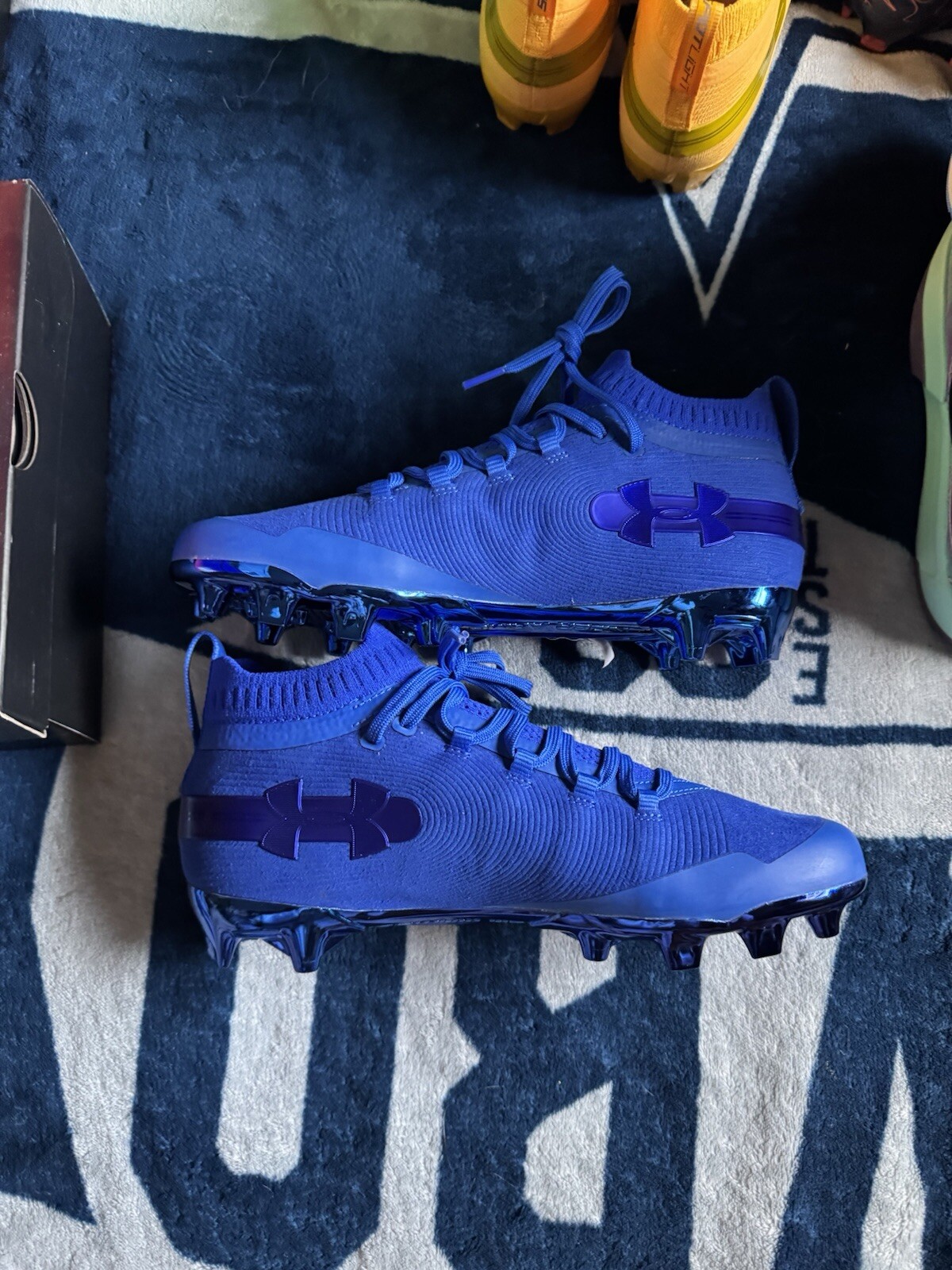 New without box, these Under Armour Spotlight MC Blue Suede Football Cleats in men's size 9 feature a lace-up closure and a mid-top shoe shaft style. They are designed for football and lacrosse performance, with cushioned, adjustable, and breathable features. The cleats have a solid pattern and a standard shoe width, suitable for activewear in all seasons. The custom-made cleats are part of the Under Armour Spotlight product line, released in 2019.
