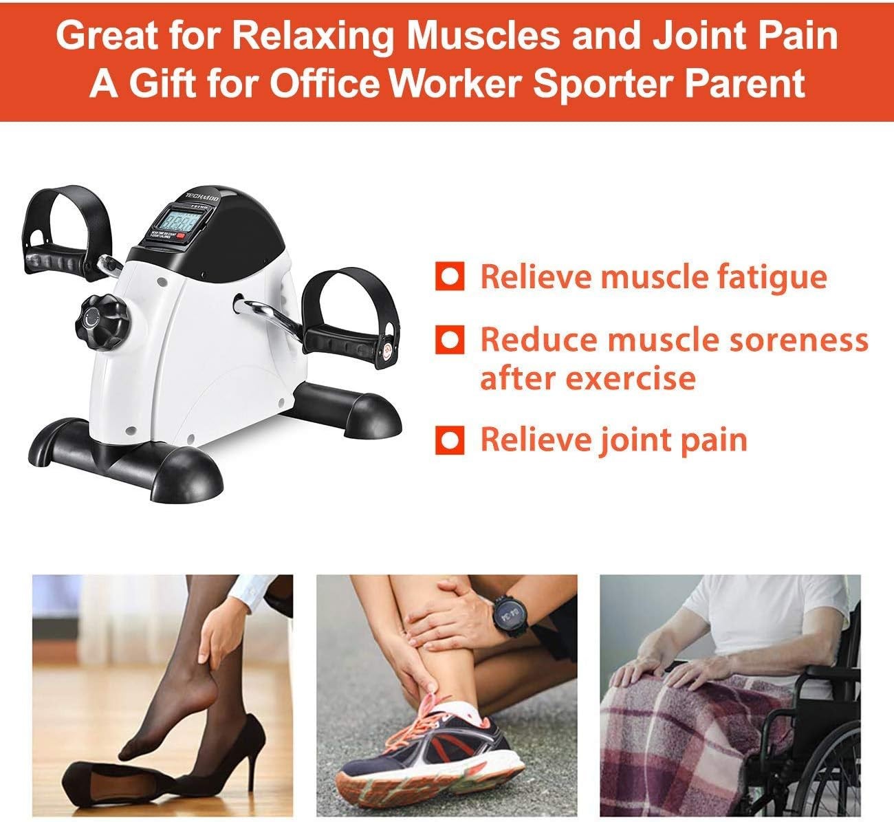 Under Desk Bike Pedal Exerciser Portable Home Exercise Black & White Product Details Maximum Weight Recommendation: 330 Pounds Controls Type: Knob Display Type: LCD Number of Batteries: 1 AAAA batteries required. (included) Number of Resistance Levels: 2 Operation Mode: Manual Power Source: Battery Powered Manufacturer: TECHMOO Item Package Dimensions L x W x H: 16.42 x 13.27 x 7.99 inches Package Weight: 3.93 Kilograms Item Dimensions LxWxH: 16 x 14.08 x 12.6 inches Brand Name: TECHMOO Suggested Users: unisex Part Number: TH-EB-5302 Brand: TECHMOO Item Weight: 3.5 Kilograms Color: Black & White Material: Alloy Steel Product Dimensions: 14.08"D x 16"W x 12.6"H Adjustable Resistance: Easily adjust the resistance level with the tension knob to personalize for yourself. This pedal exerciser fit offer low impact for light leg and knee recovery exercise. Functional LCD Monitor Displays: LCD display includes exercise time, revolution count, revolutions per minute(RPM), calories burned and resetting button and easily to arrange your exercis information data. Unique Compact Design: The office workout equipment exercise bike convenient for carry and store. Space free very easy to fold and un-fold easily fitting under a desk or similar space. Personalized Exercise Experience: Mini exercise bike is designed for knee and shoulder recovery exercise or leg and arm light cycling exercise. Lets you easily take it with you as under desk bike. Sport Exercise Widely Used: Exercise peddler portable smart and contracted bike for leg & arm cycling exercise,under desk,on table, indoor or office anywhere you can. When you are on phone, watching tv, working can do exercise.