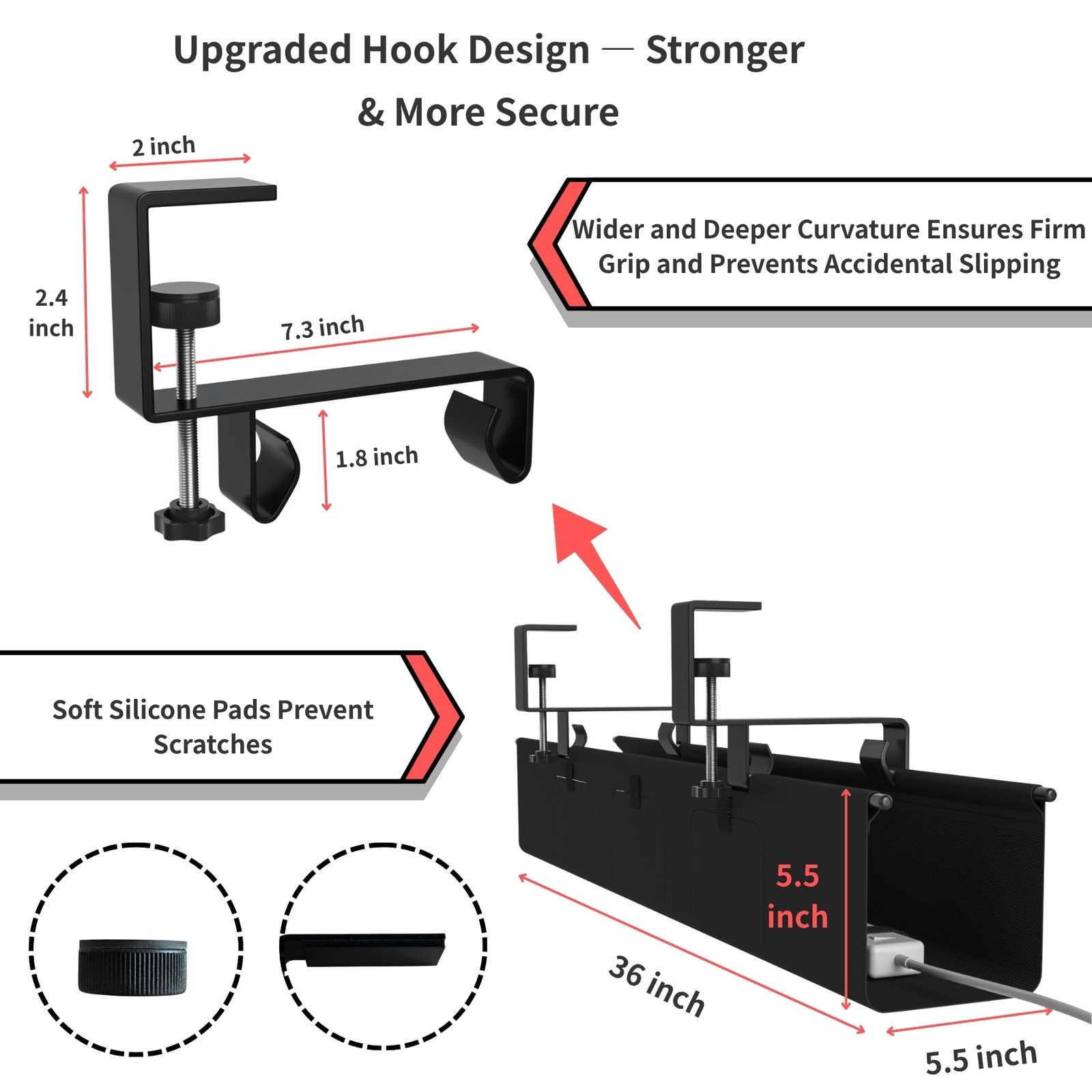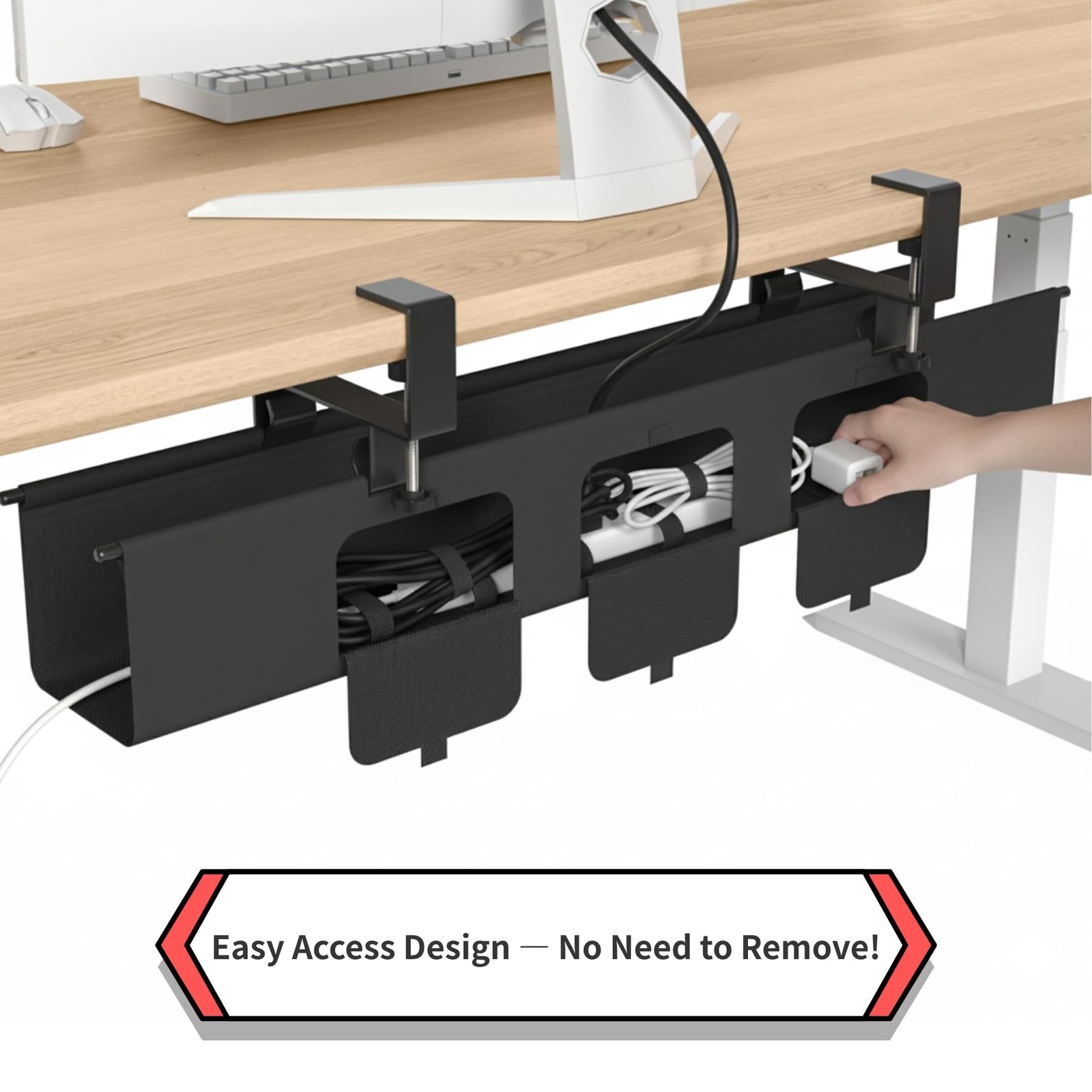 Innovative 3-Port Velcro Access: Revolutionize your cable management with three strategically placed Velcro openings; this unique design allows you to easily switch outlets, access power buttons, or adjust internal items without ever having to unmount or detach the entire tray. 【Massive 36-Inch Under Desk Cable Management】Instantly declutter your entire workspace. This extra-long 36" under desk cable management tray offers a huge capacity to effortlessly conceal all sizes of power strips, adapters, and cords. It provides comprehensive wire management beneath your desk, keeping your standing desk or office setup organized and professional 【Reinforced Clamp for Heavy Duty Stability】Secure no-drill installation. This cable organizer utilizes a robust clamp mount system that avoids desk damage from screws. The clamp features an enlarged contact pad, significantly increasing the grip surface area for wobble-free, heavy-duty support for all your electronics and desk accessories 【Innovative 3-Port Hook & Loop Access】Revolutionize your cord management. Designed with three strategically placed hook and loop openings, this unique tray allows you to easily switch outlets or access power buttons. This design ensures you can adjust internal desk cable organizer items without ever having to unmount the entire unit 【Premium 600D Fabric Desk Wire Organizer】Durable and structured design. Constructed from thick 600D Oxford fabric, this under desk cord organizer is built for long-lasting use. The tray includes bottom support to ensure it maintains its elegant shape even when holding heavy power bricks, providing a sleek cable management solution for home or office 【Reliable Support & Fitment Reminder】Strong weight capacity for all cables. The sturdy clamp system ensures a reliable under table cable management experience. 【Important Reminder】 To ensure secure installation, please verify you have at least 5.5 inches of clear space along your desk edge to properly accommodate the mounting clamps