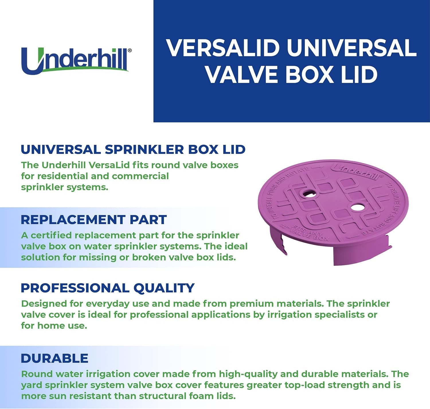 Underhill Sprinkler Valve Round Box Lid, VersaLid 10 10 Inch, Purple - 1 Pack Description Features: UNIVERSAL SPRINKLER BOX LID – The Underhill VersaLid fits round valve boxes for residential and commercial sprinkler systems. COMPATIBILITY – The universal fit irrigation valve box cover fits 10-inch round boxes. Purple lid cover for non-portable/reclaimed (non-drinking) water. DURABLE – Round water irrigation cover made from high quality and durable materials. The yard sprinkler system valve box cover features an increased top-load strength and it’s more sun resistant than structural foam lids. REPLACEMENT PART – A certified replacement part for the sprinkler valve box on water sprinkler systems. The ideal solution for missing or broken valve box lids. PROFESSIONAL QUALITY – Designed for everyday use and made from premium materials. The sprinkler valve cover is ideal for professional applications by irrigation specialists or for home use. Product Details: Brand: Underhill Color: Purple - 1 Pack Material: Plastic Style: Compact Manufacturer: Underhill Number of Items: 1 Package Dimensions: 9.96 x 9.8 x 2.24 inches Item Weight: 12 ounces Item model number: VL-10P Handling We will ship all orders within 1 business day of payment. Delivery We Do Not Ship Outside of the Continental US. Return Policy All items qualify for returns within 30 days of receipt. Buyer is responsible for return shipping on any item that is not damaged. Feedback We take our reputation seriously, we buy and sell online, so we understand the value of trust. If you are unsatisfied with your order, please contact us and we will work with you to resolve it to your satisfaction.