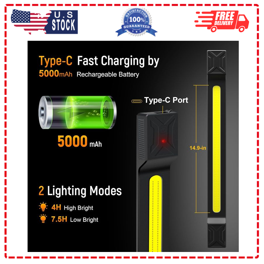 CLAKAP Underhood Work Light, 2600LM High Bright 5000mAh Rechargeable Magnetic LED Work Lights for Mechanics, Automotive Under Hood Light Bar Cordless Car Light for Car Repairing Garage Workshop Color Black Shape Strip Material Acrylonitrile Butadiene Styrene (ABS) Finish Type Painted Light Source Type LED About this item Bright Engine Underhood Light: With a built-in 5000mAh capacity battery, this rechargeable LED work light provides 4 hours of continuous usage in high brightness mode of 2600Lumens and 7.5 hours in low brightness mode of 1300Lumens. Weighing only 0.92lbs, this foldable under hood work light can easily extend from 31.5" to a maximum length of 110.2" , making it very easy to store with a compact size of just a fist. Ideal for underhood work, vehicle maintenance, and various tasks in your garage or workspace. Flexible & Versatile Light: Our rechargeable work light fixture boasts a dual functionality, allowing it to be used as an independent magnetic work light or under hood light bar via the elastic accessories. This work hood light bar is equipped with 2 powerful magnets, allowing you to easily secure it onto various metal surfaces such as car hoods, workbenches, or RVs. Featuring a flexible and detachable design, the adjustable cushioned hooks ensure that rechargeable work light bar stays securely in place on almost any vehicle. The hooks are lined with foam padding, protecting your vehicle from scratches and preventing the buckles from falling off. Powerful COB Lighting: The light strip of the underhood work light made of harmless, soft silicone. The 14.9-inch COB panel illuminates your work area with ample light, making it an essential rechargeable work light for any situation. Perfect for providing bright and clear illumination for vehicle repairs, inspections, and detailing, as well as other tasks that require sufficient lighting. Type-C Charging: With a convenient Type-C charging port, this rechargeable work light is equipped with a high-quality COB and a 5000mAh high capacity battery. Enjoy extended working hours without the hassle of changing batteries or dealing with messy cords. Suitable for portable lighting solutions in various settings such as home projects, garages, attics, basements, outdoor areas, and construction sites. 360°Rotation: The cordless work light strip on both ends of this light is equipped with a 360-degree rotating buckle, allowing you to easily adjust the angle to your desired position. Enjoy the flexibility and convenience of directing the light exactly where you need it, making it the perfect companion for various tasks and lighting needs. Easy to Carry: Thin, lightweight, and sturdy, this rechargeable work light is designed for easy portability. Say goodbye to bulky and inconvenient mechanic work lights. Rest assured, our rechargeable magnetic hood light will eliminate the hassle of carrying heavy and bulky lights, allowing you to focus on your tasks without the burden of cumbersome tools. 2 Lighting Modes: This mechanic work light offers 2 convenient lighting modes - 100% brightness and 50% brightness. With no unnecessary modes to complicate things, you have the perfect lighting options to meet your different needs. Feel confident with the brightness and longevity of this cordless light for engine work, vehicle inspections, repairs, and more. Wide Applications: This car hood light is incredibly versatile! Not only is it suitable for vehicle maintenance, inspection, and detailing, but it also excels in any other area that requires illumination. Whether you're working on home projects, in garages, attics, basements, at outdoor areas, or various construction sites, this magnetic work light is a powerful and reliable work light. Add it to your toolbox for exceptional lighting solutions whenever you need them. . We offer FREE shipping on all orders! . We ship within Five business days of payment, usually sooner. . We use a selection of shipping services such as UPS, FedEx, USPS etc. . We only ship to the lower 48 states, no APO/FPO addresses or PO Boxes allowed. . Local pickups and combined shipping options are not provided at this time. . Your satisfaction is a wonderful reward for our efforts. Please assist us by leaving a positive review if you feel pleased with our service. . In the event that you encounter any difficulties related to your order, please do not hesitate to reach out to us directly through the Messaging system on the Ebay platform. Kindly consider opening a COMPLAINT or a RETURN REQUEST as a last resort, only after all other possible measures have been attempted and we have been unable to provide you with assistance. . We will get in touch with you within 24 hours and make every effort to ensure your satisfaction. . Please rest assured of our service quality.
