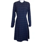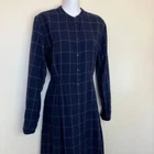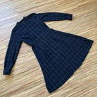 Uniqlo navy blue plaid flannel shirt dress has a fitted bodice, long sleeves, and band collar. Full button front. Tag doesn't note fabric content - feels like brushed cotton flannel fabric. Tag size "Medium" - see below for garment measurements. Good pre-owned condition. Measurements taken when garment is laying flat: Chest: 20" across (40" around) Waist: 15 1/2" across (31" around) Hips: 24" across (48" around) Length measured from top of shoulder to hem: 40" Sleeve length: 24" from top of shoulder to cuff Ships from Alberta, Canada. Tax applies to purchases.