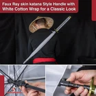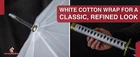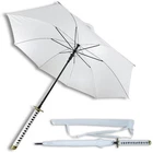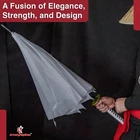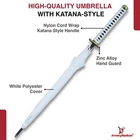 Step out in style with this eye-catching katana-inspired umbrella , designed to blend practicality and elegance. Specifications: Overall Length: 39 inches Handle Length: 11 inches Features: Stylish White Canopy: Offers ample coverage and comes with a matching polyester cover for a cohesive look. Katana-Style Handle: Features a faux ray skin design with a white cotton wrap, mimicking a traditional katana hilt for a secure and unique grip. Rounded Metal Guard: Adds a touch of authenticity and enhances the aesthetic appeal. Carry Handle: For easy portability, making it perfect for both collectors and everyday use. This high-quality umbrella not only protects you from the elements but also makes a bold statement. Whether you're a collector of unique items or simply looking to elevate your daily essentials, this katana-inspired umbrella is the perfect choice. Functional, stylish, and sure to be a conversation starter, it's ideal for rain or shine.