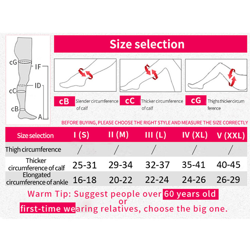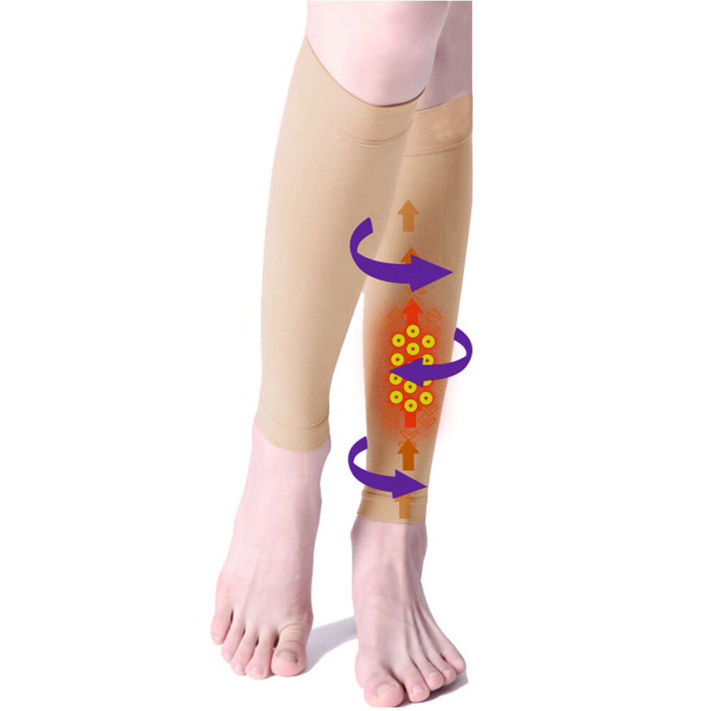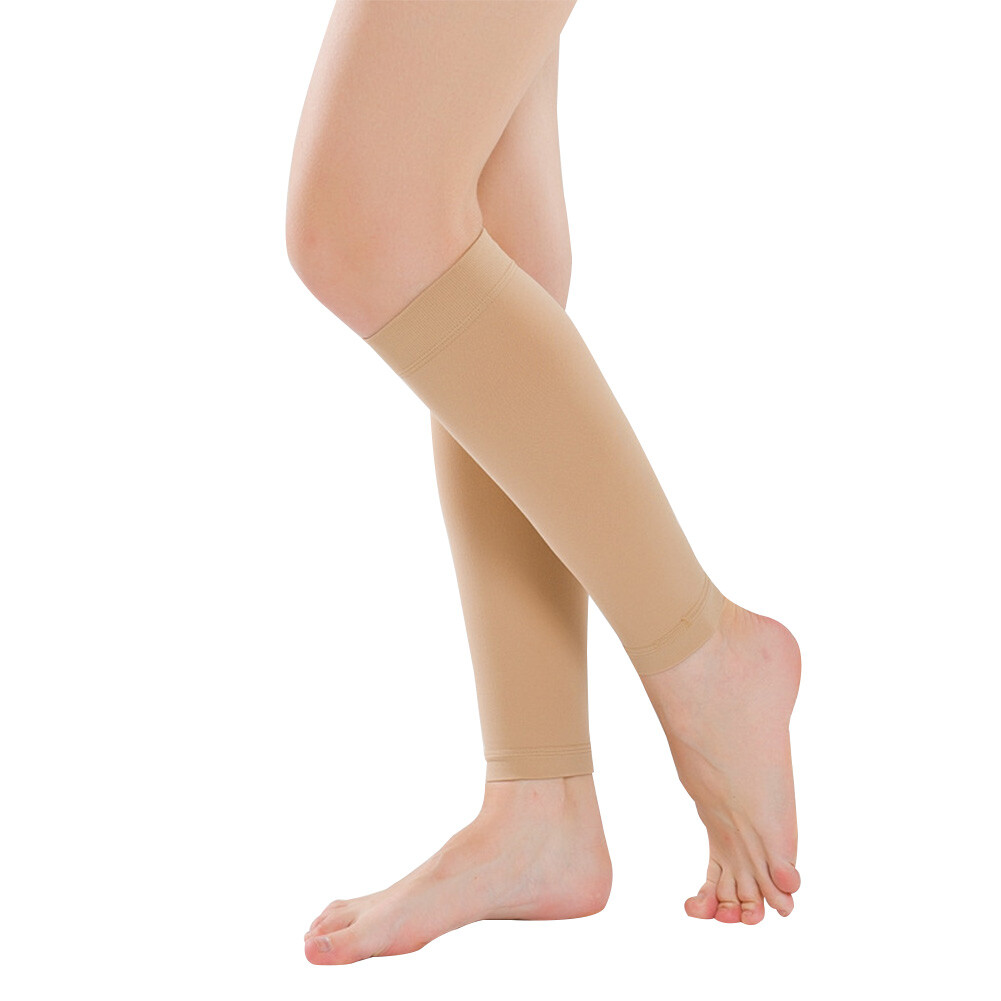 Item Description: Material: Lycra Color: Beige/Black Compression Strength: 23-32 mmHg (Class II) Typical Applications: Moderate edema, Lymphedema, Post-surgery, Pregnancy, Moderate varicose veins, Deep Vein Thrombosis(DVT) Why you need compression socks? If you've suffered with varicose veins for a long time, you'll be familiar with soreness, swelling and fatigue on your aching leg. Varicose veins appear when the one-way valves in your veins fail and allow blood to leak backward. It's the pooling of blood because of this valve failure that causes the squiggly, bulging blue veins to pop out. Our compression socks can help relieve from varicose veins, promoting blood and oxygen circulation more effectively, preventing cramping, fatigue, stiffness and swelling, faster recovery. How compression socks work? Our medical compression socks has strict compression level of each key measuring point. The graduated compression provides maximum compression at the ankle with a progressive reduction through the calf, which enhance the return of venous blood to the heart. Who can benefit from compression socks? Long-distance travellers Aircraft flight related practitioner Professionals involving prolonged sitting / standing in one place Sufferers of varicose veins & related venous disorders Pregnant women with lower limb edema Which compression class should I choose? A higher level of compression requires more physical strength to don and doff. Higher level is tighter. If you are unsure, we recommend you to consult your physician for the appropriate level of compression, as noted in mmHg value. Warm Tips: 1.If conditions permit, we strongly recommend purchasing 2 pairs to replace, as double its life for each pair. Don't wear a single pair for more than 3 days, because a long time wear will affect the recovery of elastic socks. 2.Better to wear your compression stockings during the day and take them off before going to bed. Washing Instruction: 1.It's imperative that the garment is washed after each use. Washing brings back the elasticity to the socks. 2.To prolong the garment life, hand wash with warm water (below 30℃) and mild laundry soap or detergent. Use chloride-free bleach. Do not wring out, gently squeeze excess water to hang and air-dry. Do not dry clean or iron. Package Includes: 1 Pair Unisex Compression Calf Sleeves