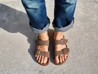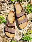 Product Description Birkenstock Arizona Slide Sandal - Men's Birkenstock has set the standard for comfortable footwear! Slip on your pair of Arizona slides and feel supported throughout the day thanks to a contoured footbed that's anatomically formed for supreme comfort. FEATURES Birko-Flor™ faux leather upper Slip-on with adjustable straps Round open toe Synthetic lining Contoured footbed Cork midsole EVA sole Made in Germany