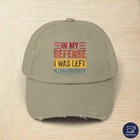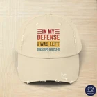 In My Deffense I Was Left Unsupervises is cool and funny gift for men, mind, women and kids who love Accountability Humor, Responsibility Humor, Playful Excuse, Lighthearted Justification, Irreverent Explanation, Mischievous Defense, Playful Statement, Cheeky Comment, Supervision Absence, Irreverent Humor, Lighthearted Perspective, Playful Excuse, Excuse Making, Comedic Defense, Accountability Wit, Playful Rationalization, Fun Statement, Mischievous Humor, Light-Hearted Justification, Responsibility Quip PRODUCT DESCRIPTION Made with 100% cotton twill for high-end comfort and durability, these custom distressed hats bring all the style and practicality one needs in daily life. The low profile along with the D-ring closure on a self-fabric hideaway strap ensures both proper protection from the sun and that perfect, adjustable fit. .: 100% cotton twill .: Sewn-in label .: Closure: self-fabric hideaway strap with metal D-ring slider .: Printed using Direct to Film (DTF) technology .: Please note: Due to a special finishing process, distress and color may vary SIZE GUIDE Imperial One size Crown height, in 6.50 Width of front panel, in 7.37 Bill length, in 2.87 Metric One size Crown height, in 16.51 Width of front panel, in 18.73 Bill length, in 7.30 PRODUCT DESCRIPTION Made with 100% cotton twill for high-end comfort and durability, these custom distressed hats bring all the style and practicality one needs in daily life. The low profile along with the D-ring closure on a self-fabric hideaway strap ensures both proper protection from the sun and that perfect, adjustable fit. .: 100% cotton twill .: Sewn-in label .: Closure: self-fabric hideaway strap with metal D-ring slider .: Printed using Direct to Film (DTF) technology .: Please note: Due to a special finishing process, distress and color may vary SIZE GUIDE Imperial One size Crown height, in 6.50 Width of front panel, in 7.37 Bill length, in 2.87 Metric One size Crown height, in 16.51 Width of front panel, in 18.73 Bill length, in 7.30