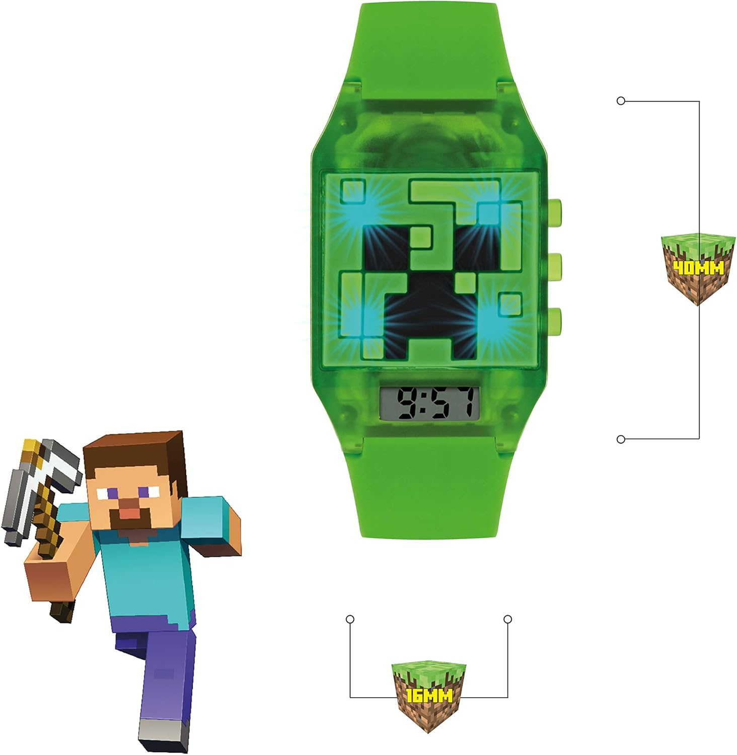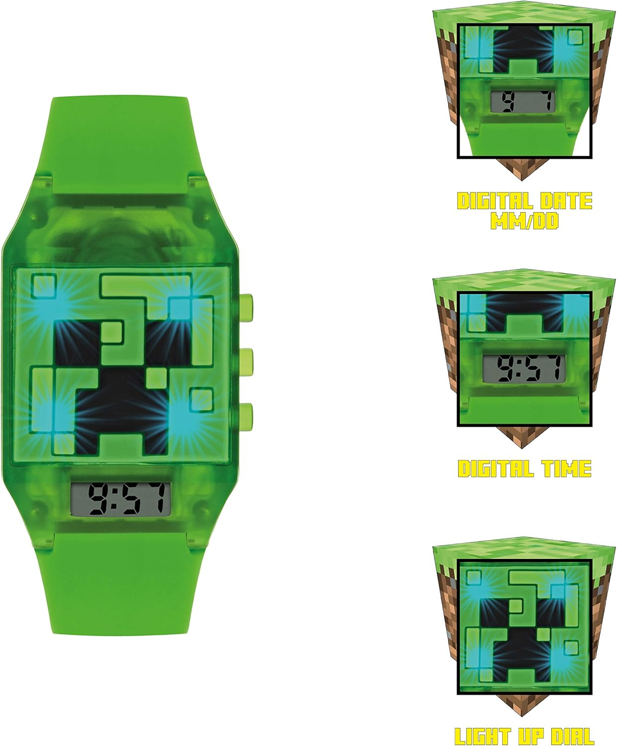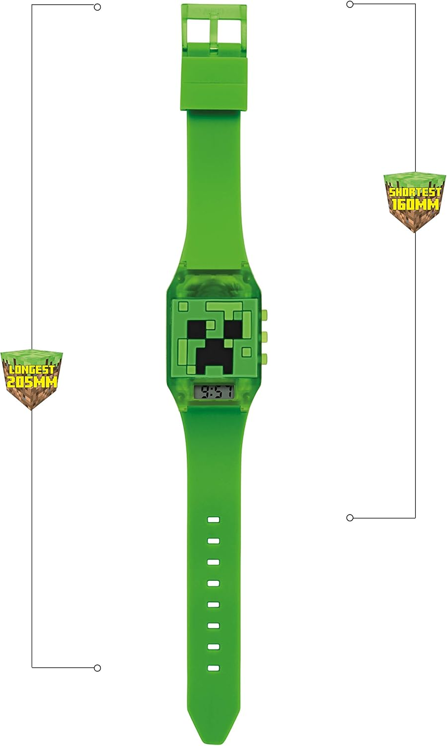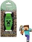 Minecraft Green rubber strap watch. Featuring a creeper design on the dial and digital display underneath. The watch lights up and displays the date + month. Includes a matching backing card and one year guarantee.