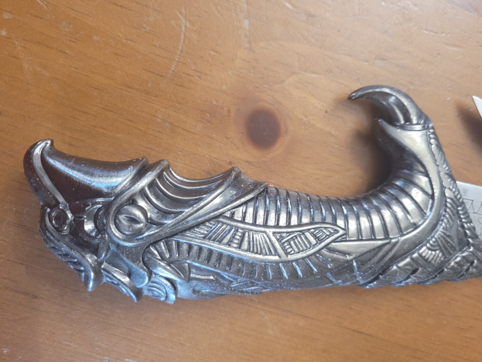 United Cutlery Egyptian Falcon Knife. Stainless steel blade, sharp, adorned with Egyptian symbols. Overall Length 14 9/16", Blade Length 8", blade thickness 3/16", Blade is Stainless steel, handle is cast metal, antique silver plated finish.