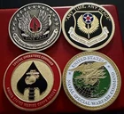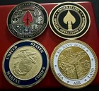 This product is a set of challenge coins featuring designs representing the United States Special Operations Commands for the Army, Navy, Marines, and Air Force. The coins are original and produced in the United States, specifically for collectors interested in militaria.