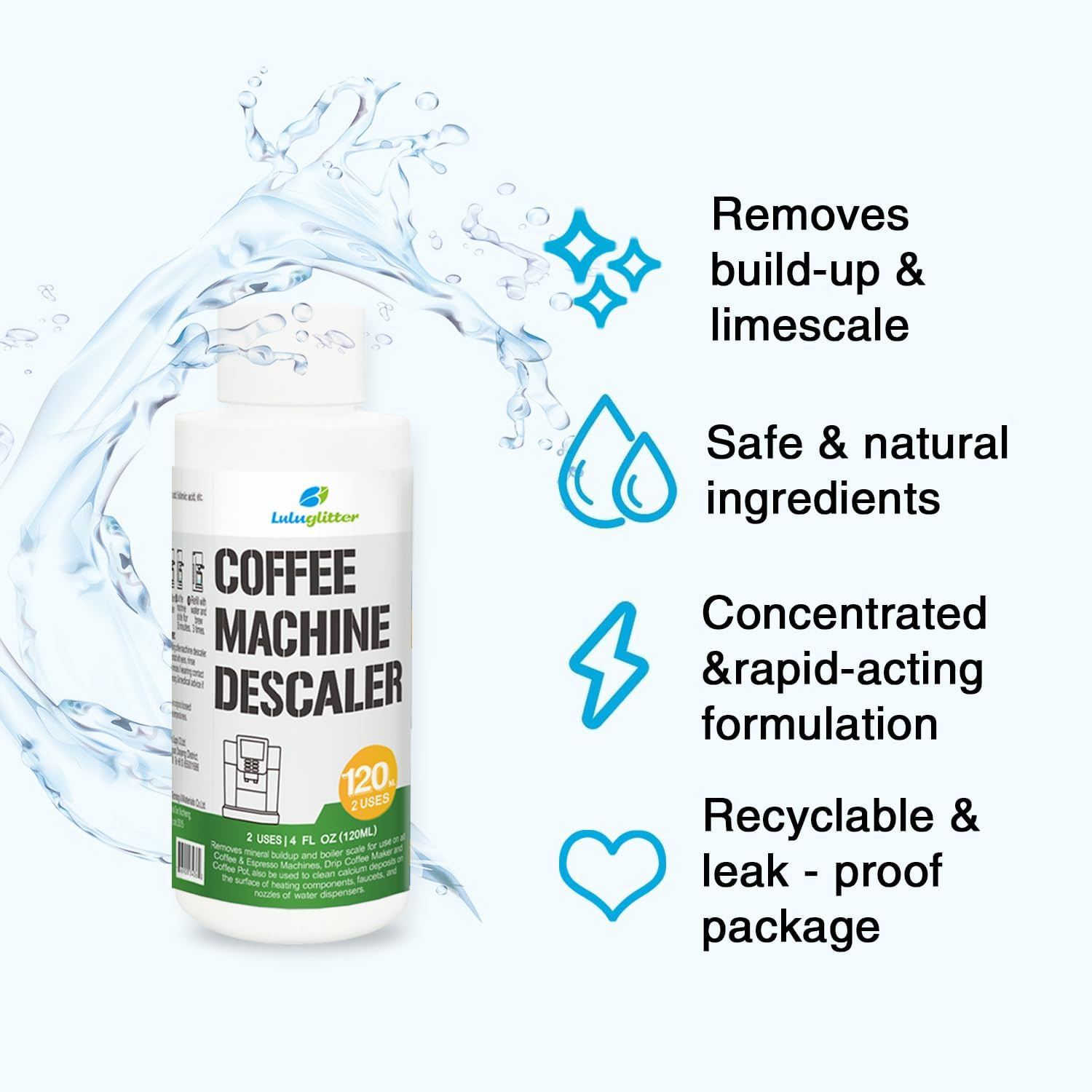 Coffee Machine Descaler, Universal Descaling Solution For Coffee Makers & Espresso Machines,Coffee Maker Cleaner And Descaler, Limescale Remover Product Details Package Dimensions : 5.35 x 3.66 x 1.89 inches; 11.36 ounces Item model number : descaler120 Manufacturer : junjing cleaner Brand: LULUGLITTER Unit Count: 1.0 Ounce Number of Items: 1 Contains Liquid Contents: Yes Manufacturer: junjing cleaner POWERFUL DESCALING SOLUTION: Our coffee descaler and cleaner is a multipurpose solution meant to remove mineral and limescale deposits on a wide variety of machines. It deeply penetrates oil and can work as a decalcifier for other home appliances SAFE For Use: Our coffee maker cleaner and descaler is made from natural concentrated citric acid that is odorless, powerful, and safe for your coffee maker and your family Extend Machine Life – Regular use of our coffee descaler significantly extends the lifespan of your machine. By using our solution, you can keep your coffee maker functioning like new for years Universal Descaling Solution -- Compatible with Keurig, Nespresso, Breville, Delonghi, Jura, Ninja, OXO, Gaggia, and Philips, is eco-friendly and specially formulated to clean your machine safely 2 BOTTLES, 4 USES - This package comes with 2 bottles of descaling solution, for a total of 4 uses. It can be used in any model machines.