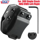 Product Description Ambidextrous gun mag pouch for right/left side carry and usable in IWB/OWB for concealed carry. Use the included Allen key to obtain your preferred tension of your pistol mag in the magazine holster. For .380 Single Stack magazine case Made in the U.S.A. with a lifetime warranty Features: left and right universal 100% and NEW Weight: 48g Size: 68.7*62*30mm Payment Shipping Terms Returns Contact Us We accept PayPal only. If buyer want to delay the payment because of financial problem, please contact me by the ebay message within 3 days Payment via PayPal (PayPal accepts all major credits/debit cards and eCheque) ECheque payment will tak e 3-10 days to get clear, thus DELAYing the shipment. Handling time: 1 business day (Orders are not processed on weekends & holidays) Tracking information will be sent once item is shipped. Local pick-up is unavailable at the moment. For international shipping and shipping to Guam, Hawaii and Alaska, Please contact us before placing the order. Item is shipped to ebay address. Leaving correct address can minimize delay. For any issues with Defects, Return, Item Exchange request, please contact us first and send us a message first before opening any type of case or request. We devote ourselves making EVERY CUSTOMER in 100% Satisfactory and resolve any problem. We highly value and appreciate your business. Thank you. No returns will be accepted without an RMA number. Please contact us for the RMA number. Return is acceptable within 30 days of delivery. Return for replacement or money back is optional. Returned items must be in the brand new, unaltered and resalable condition. Seller is not responsible for any labor cost, expense in a dealer store, or damage due to wrong installation. Return is accepted within 14 days after the buyer's receiving the item. (Excluding contrived damagement or misusage).100% money-back Guaranteed! All product will be tested in 100% before delivery.If the item is defected by the processing of postage,Buyer has up to 14 days from date of receipt for exchange of a new one.All shipping charges for returned products are to be paid by the buyer,Please contact us for the return address All messages will be answered within 24 office hours. Please contact us either by clicking "contact seller" in the "purchase history" section or simply click "ask a question" at the bottom of this page. If you are unsatisfied with our item or service, please contact us before leaving any feedback. We are committed to resolve all issues in a friendly and satisfactory manner. We always reply to messages within 2 business days (off-duty at weekend). If you do not get a response from us, then please check your junk or spam mailbox. Payment We accept PayPal only. If buyer want to delay the payment because of financial problem, please contact me by the ebay message within 3 days Payment via PayPal (PayPal accepts all major credits/debit cards and eCheque) ECheque payment will tak e 3-10 days to get clear, thus DELAYing the shipment. Shipping Handling time: 1 business day (Orders are not processed on weekends & holidays) Tracking information will be sent once item is shipped. Local pick-up is unavailable at the moment. For international shipping and shipping to Guam, Hawaii and Alaska, Please contact us before placing the order. Item is shipped to ebay address. Leaving correct address can minimize delay. Terms For any issues with Defects, Return, Item Exchange request, please contact us first and send us a message first before opening any type of case or request. We devote ourselves making EVERY CUSTOMER in 100% Satisfactory and resolve any problem. We highly value and appreciate your business. Thank you. No returns will be accepted without an RMA number. Please contact us for the RMA number. Return is acceptable within 30 days of delivery. Return for replacement or money back is optional. Returned items must be in the brand new, unaltered and resalable condition. Seller is not responsible for any labor cost, expense in a dealer store, or damage due to wrong installation. Returns Return is accepted within 14 days after the buyer's receiving the item. (Excluding contrived damagement or misusage).100% money-back Guaranteed! All product will be tested in 100% before delivery.If the item is defected by the processing of postage,Buyer has up to 14 days from date of receipt for exchange of a new one.All shipping charges for returned products are to be paid by the buyer,Please contact us for the return address Contact Us All messages will be answered within 24 office hours. Please contact us either by clicking "contact seller" in the "purchase history" section or simply click "ask a question" at the bottom of this page. If you are unsatisfied with our item or service, please contact us before leaving any feedback. We are committed to resolve all issues in a friendly and satisfactory manner. We always reply to messages within 2 business days (off-duty at weekend). If you do not get a response from us, then please check your junk or spam mailbox. powered by