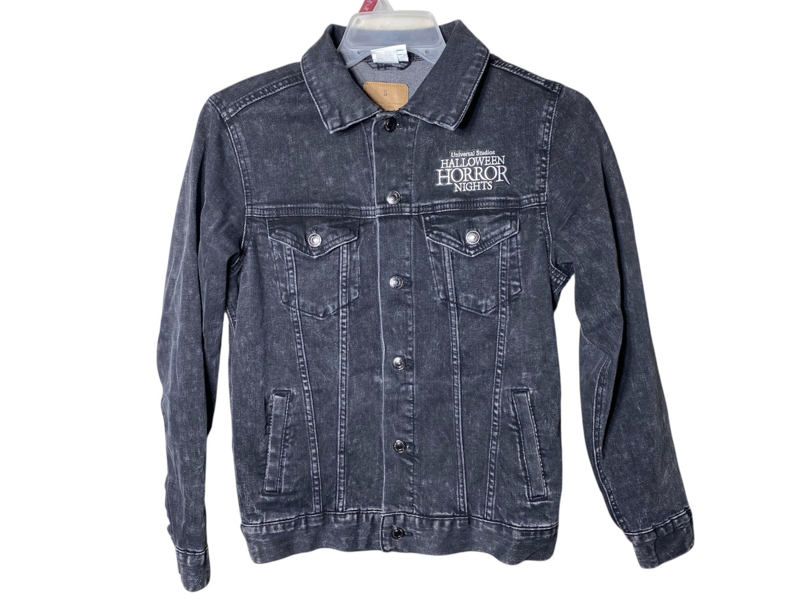 The product is a Universal Studios Halloween horror nights Jean jacket featuring official Classic Monsters designs. Made of cotton with a denim fabric type, this black jacket has a button closure and is insulated with polyester. It is in size small and is part of the Halloween theme collection by Universal Studios Hollywood. The jacket is a casual style for men and comes in a regular fit. Perfect for adding a touch of horror and style to your wardrobe during the Halloween season.