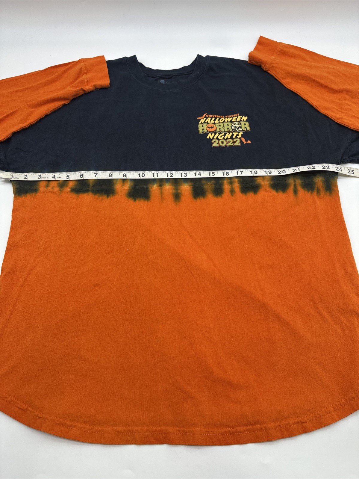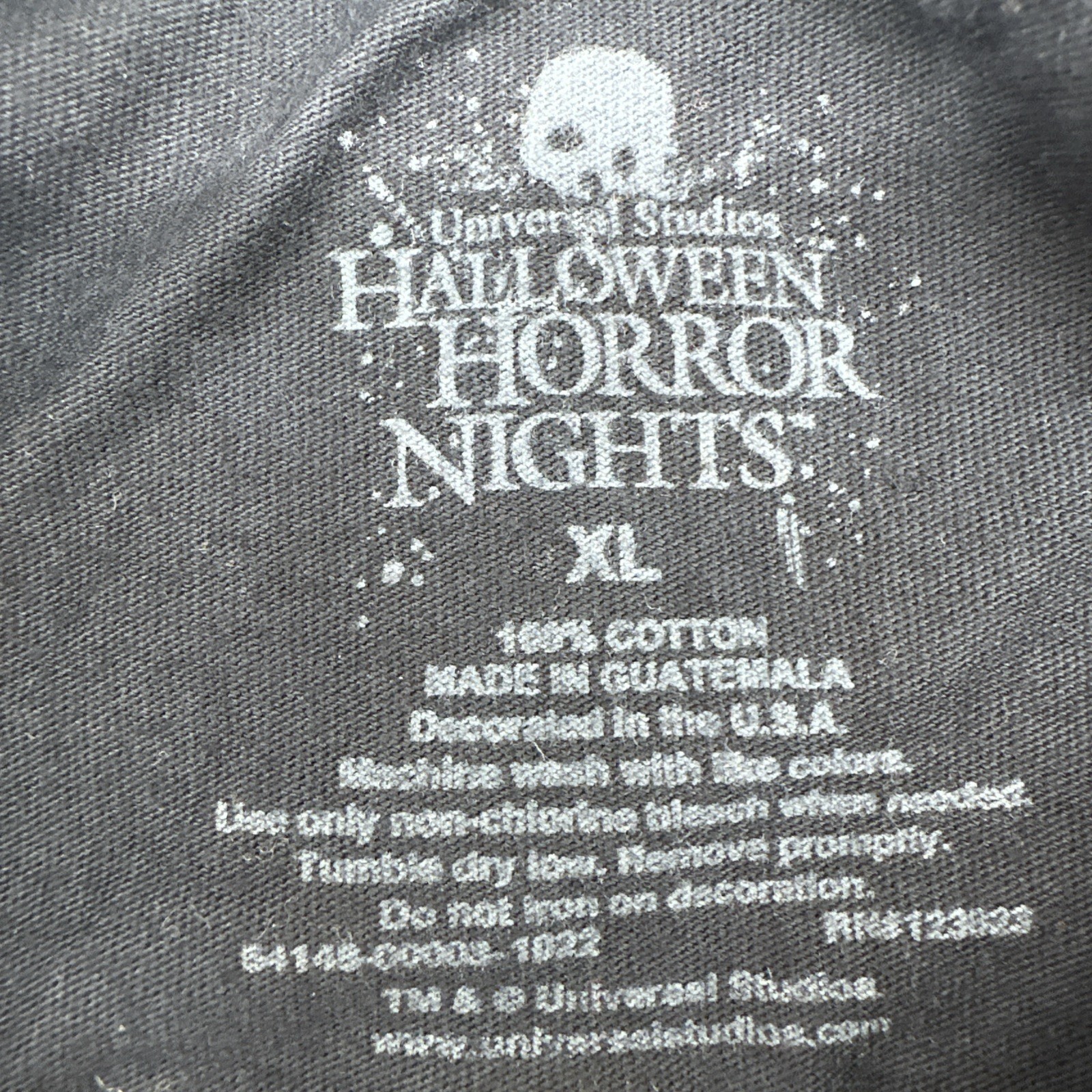 The product is a long sleeve shirt featuring a graphic print of the Universal Studios Hollywood logo, designed for Halloween Horror Nights. Made of cotton, the multicolor shirt in size XL has a crew neck and regular fit, suitable for men. The t-shirt is suitable for all seasons, especially fall and spring, and is perfect for fans of Universal Studios Hollywood and Halloween enthusiasts. Made in Guatemala, this shirt is a stylish and comfortable addition to any wardrobe. Check pictures for flaws and measurements