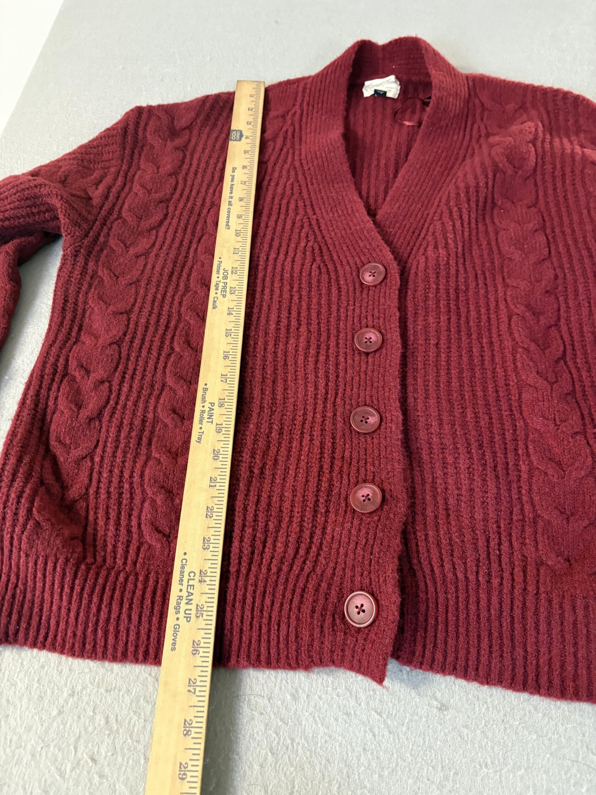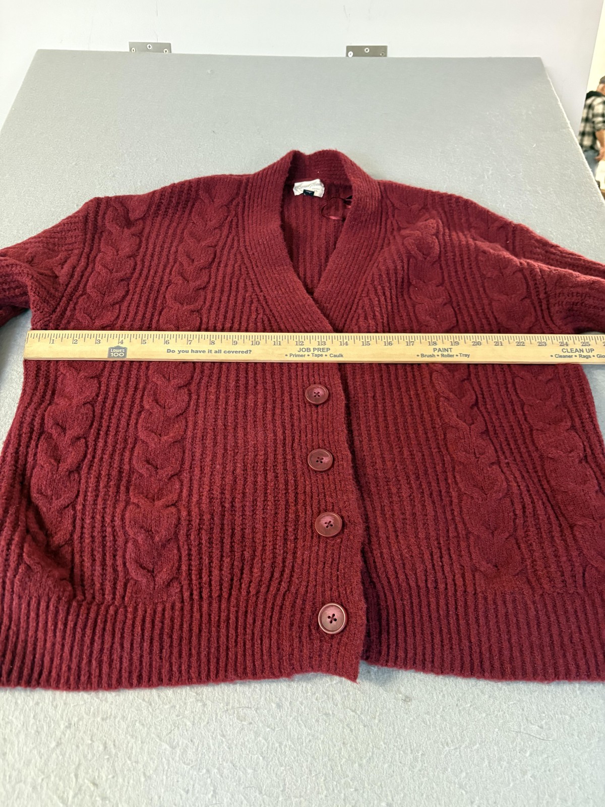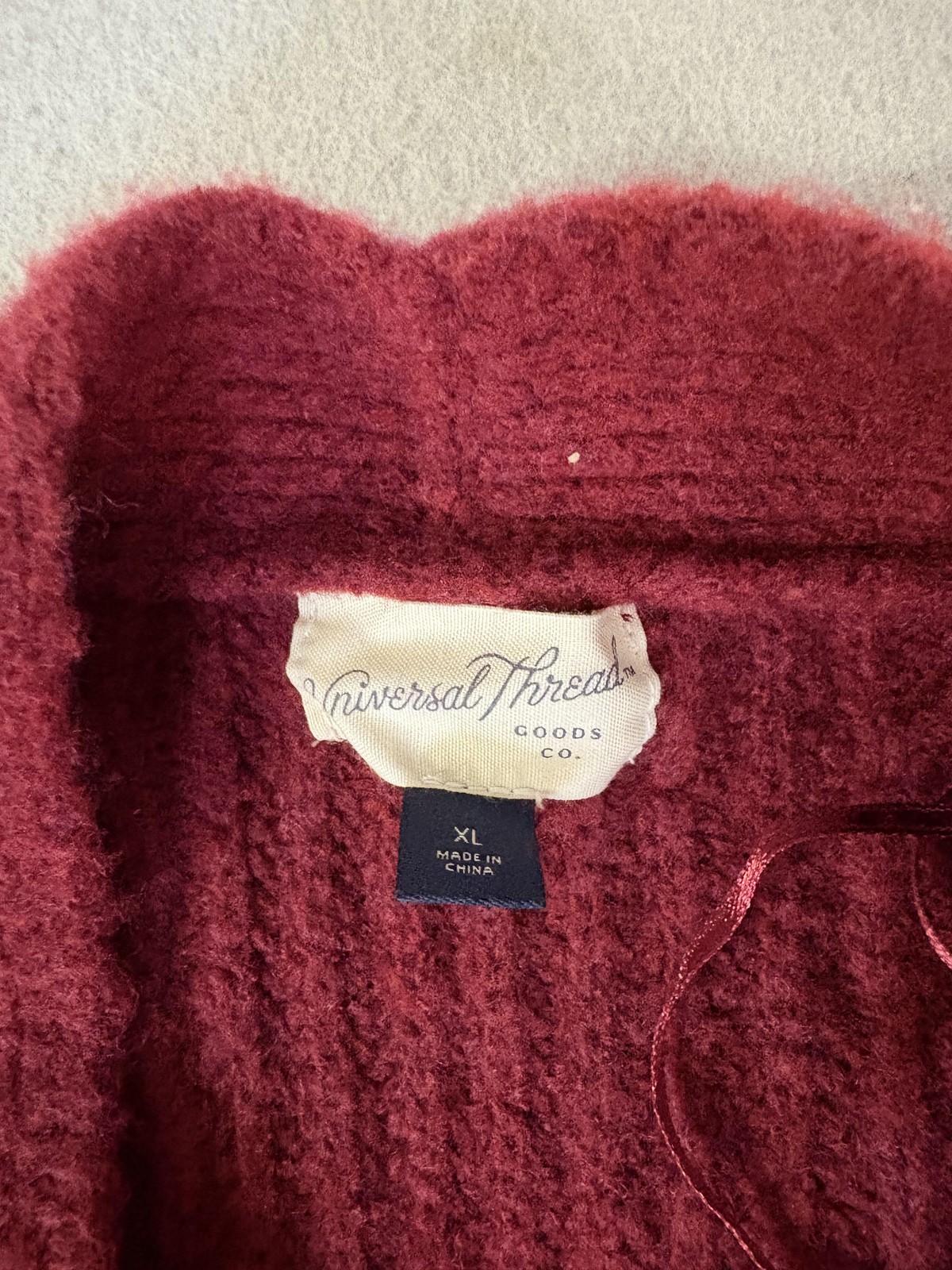 Brand: Universal Thread Goods Co. Item: Women's cardigan sweater with button front Tag size: XL Color: Burgundy / dark red Material: 77% recycled polyester / 20% acrylic / 3% spandex Made in China Features: Cable knit pattern front and back; ribbed cuffs and hem; V-neck cardigan styling; soft cozy feel Care per tag: Turn inside out and close buttons; machine wash cold delicate; only non-chlorine bleach if needed; reshape and lay flat to dry; warm iron if needed Identifiers: RN 17730; VN1298251 Notes: Tag sizing may vary by brand; compare to a similar sweater for best fit.