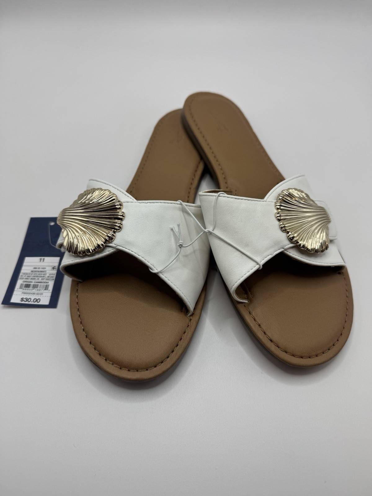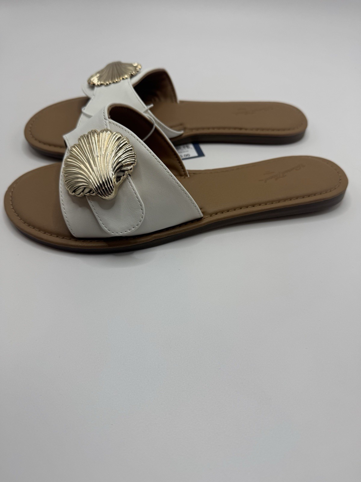 The Universal Thread Women's White Flat Sandals with Shell Accent are perfect for a casual occasion during the warm seasons of summer and spring. These slip-on sandals feature a solid white color with shell accents, adding a touch of elegance to the style. The flat heel design provides comfort and stability, while the synthetic upper material ensures durability. Ideal for women in US shoe size 11, these slide sandals are a trendy and versatile addition to any wardrobe. A2T2 0333 0334 0335 0336 0337