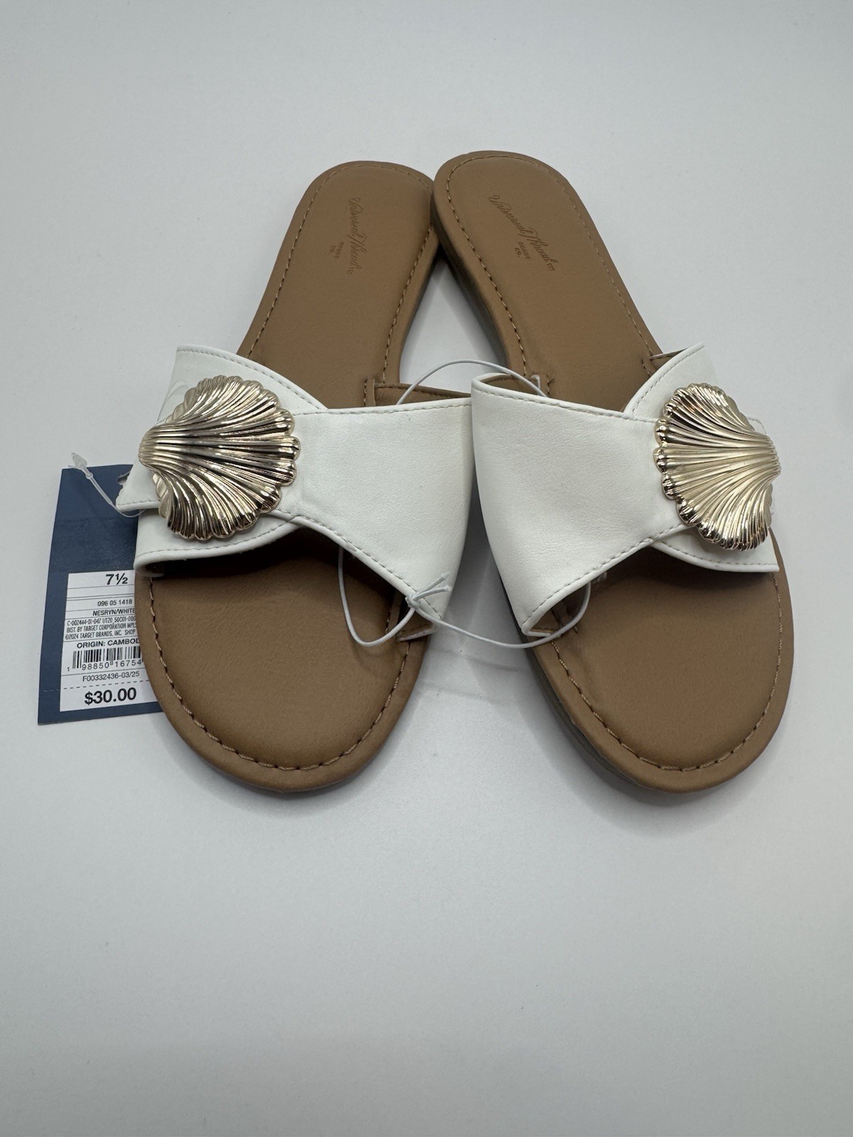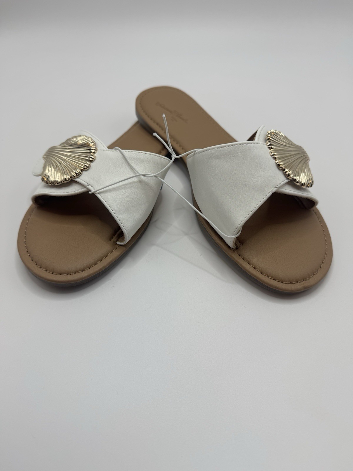 The Universal Thread Women's White Flat Sandals with Shell Accent in size 7.5 are a stylish and comfortable option for casual occasions. The slip-on design and flat heel make them easy to wear throughout the day, while the shelled accents add a unique touch to the solid white color. Perfect for summer and spring, these sandals by Universal Thread are a versatile addition to any woman's wardrobe. A2T2 0315 0316 0317 0318 0319 0320 0321 0322