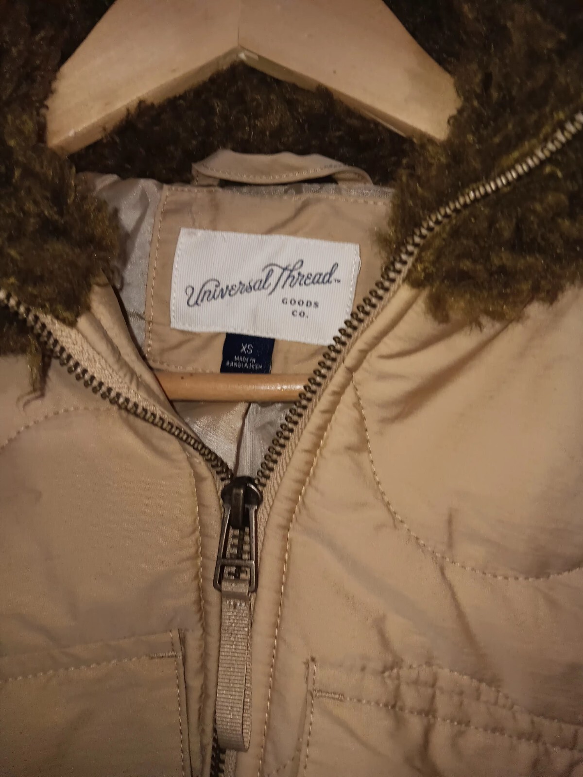 This is a women's Universal Thread overcoat in size XS, designed in a stylish brown color with a fur trim. The outer shell material is polyester, providing warmth and comfort. The coat features inner pockets for practicality and convenience. Perfect for cooler weather, this coat combines fashion with functionality, offering a chic and cozy option for everyday wear.