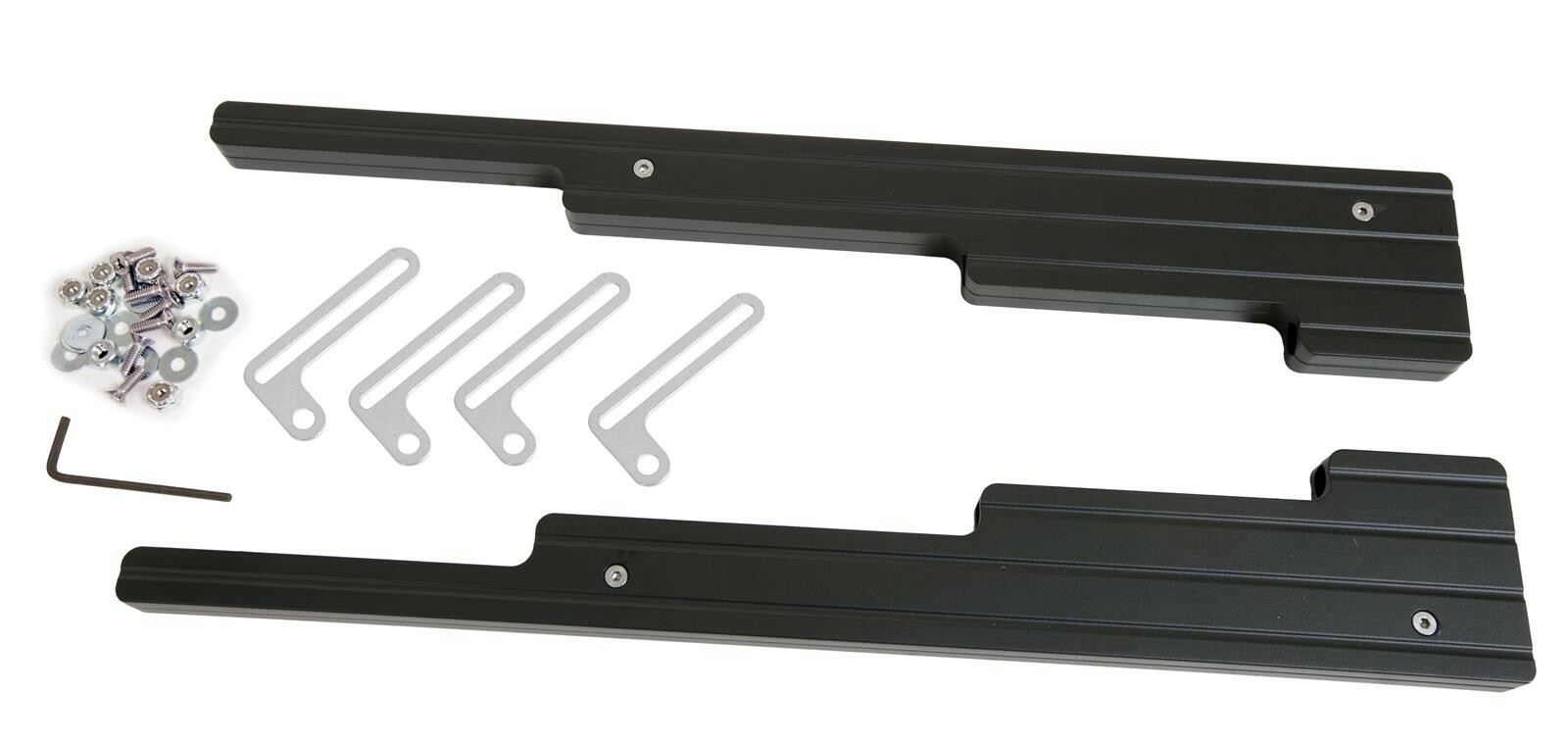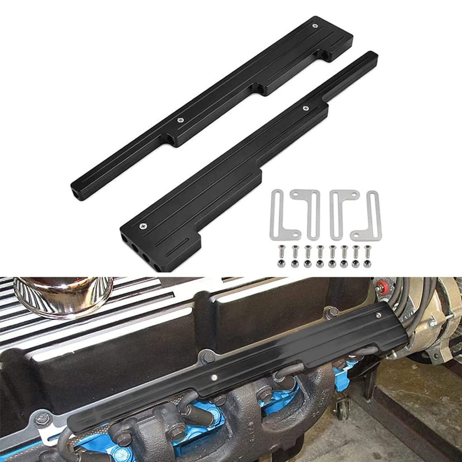 These billet spark plug wire guides offer a clean alternative to the ignition wire dilemma by routing the wires in a simple straight-forward fashion. Their aluminum construction features a polished finish that will make your motor stand out while keeping the wires safely off the hot exhaust. They are a universal fit and should work with most Ford, GM, and Mopar V-8 engines. These billet wire looms feature adjustable tabs that attach to the base of the valve covers with their mounting bolts. Use up to 8mm wire on nearly any V8 engine. Internal grooves conceal and divide spark plug wires up to 8 MM in diameter Adjustable mounting tabs allow installation on nearly any V8 engine Semi Gloss Black Finish Aluminum Classic Ball Milled Design Will Not work on center bolt heads Will Not clear