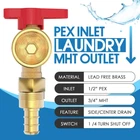 Package Includes: Washing Machine Outlet Box, 1/2-Inch Pex Crimp Connection x 3/4 Inch MHT; Support Bracket ×2 Pipe Compatibility: This pex washing machine outlet box is with crimp pex fitting system, NOT with expanding fitting system. The box is equipped with 1/4-turn hot and cold shut off valves; the inlets of washing machine box work well with 1/2 inch PEX pipes; the outlets fit well with 3/4 inch MHT washing machine hoses Long Lasting: The washing machine outlet box is made from high-quality C46500 brass, known for its high corrosion and abrasion resistance. This material ensures long-lasting performance and reliable water flow Standards Compliance: The washing machine outlet box meets American standards and complies with UPC and NSF requirements, ensuring adherence to strict safety and quality standards Versatile Applications: 1/2 pex washing machine outlet box allows for inverted installation and provides solutions for a range of residential washing machine applications. It features a recessed design and features a snap on frame which accommodates to drywall Flexible Installation: The washing machine outlet box is perfect for connecting your washing machine or water dispenser to your water supply