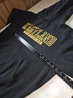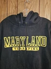 This is a University of Maryland men's black hoodie featuring an embroidered patch logo of the Jansport brand. It is officially licensed for the NCAA regular season and showcases the Maryland Terrapins football team. The hoodie is a size L for men and is designed in Cambodia.